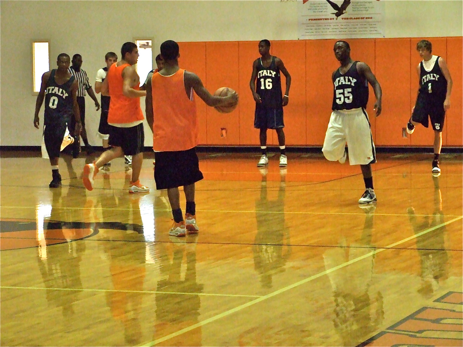 Gladiators shoot the roundball inside Avalon’s half sphere « previous story album next » Checking the wheels — The wheels on the chariot go round and round. The Gladiator defense checks their wheels before starting the race to the other end of the floor. (Barry Byers) Download original photo