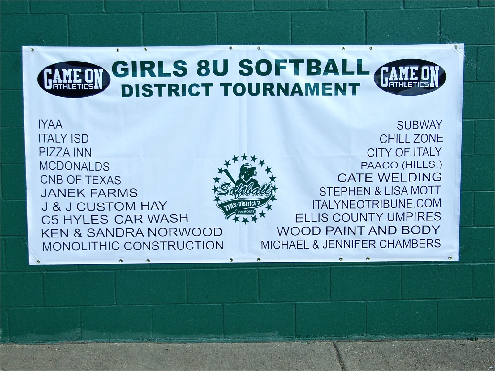Banner day — Girls 8u Softball District Tournament banner donated by Game On Athletics displays tournament sponsors. “CHAMPIONS” will be added and presented to the winning team. (Barry Byers)