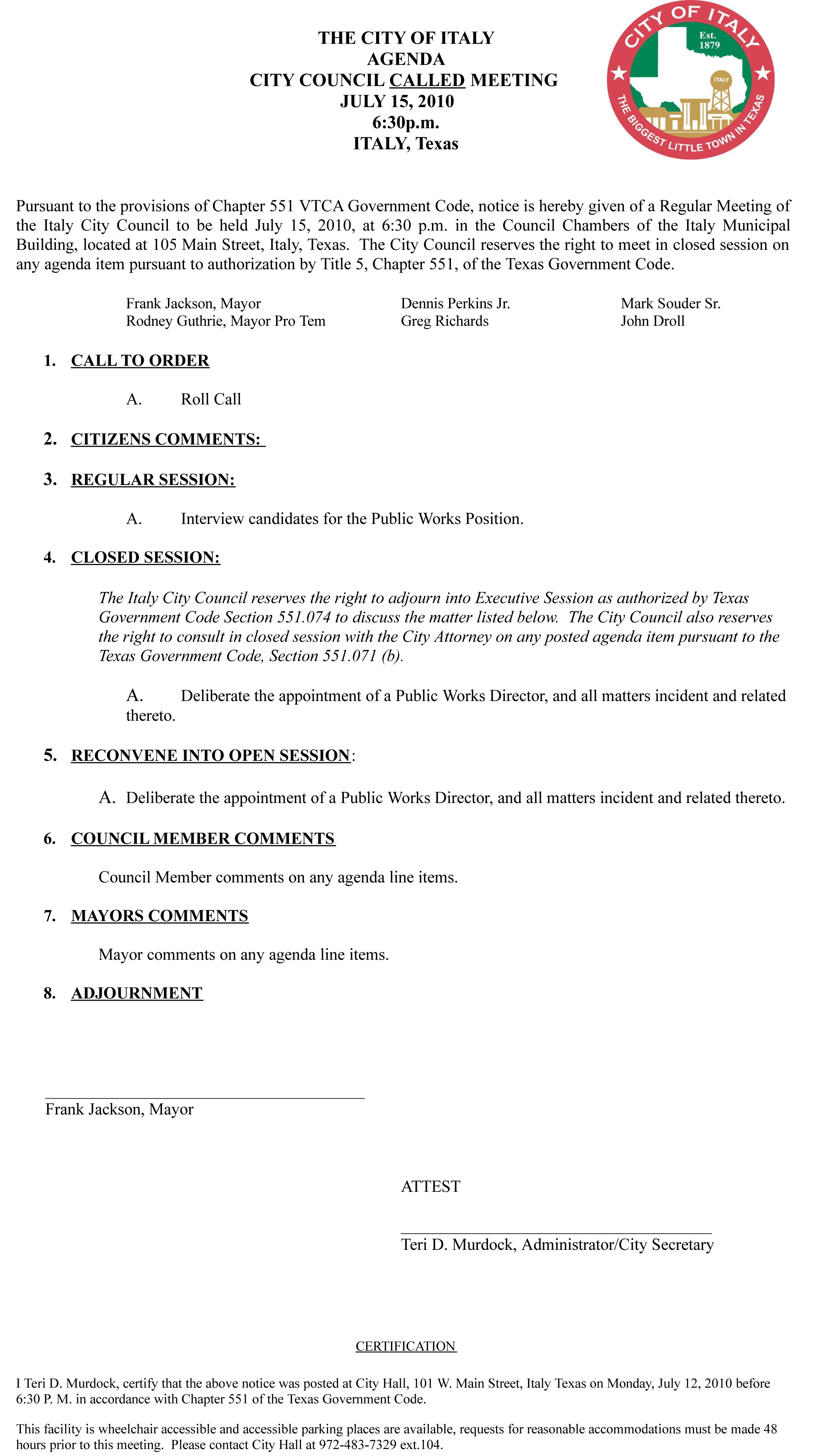 Agenda: Italy City Council Called Meeting, July 15, 2010 « previous story album next » Agenda (http://www.ci.italy.tx.us/) Download original photo