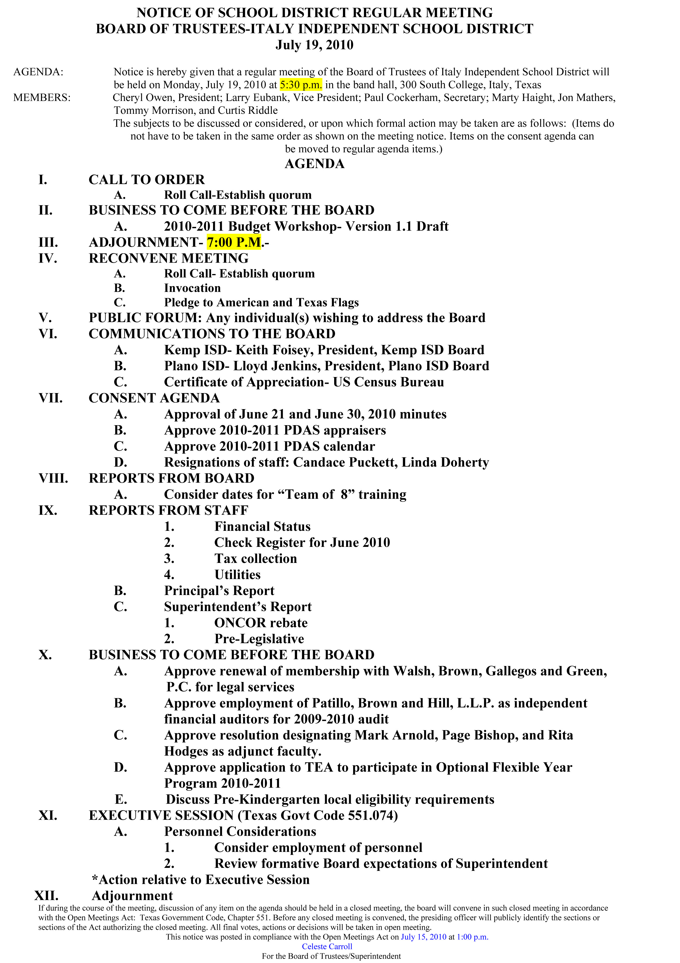 Agenda: Italy ISD School Board Meeting, July 19, 2010 « previous story album next » Agenda Download original photo