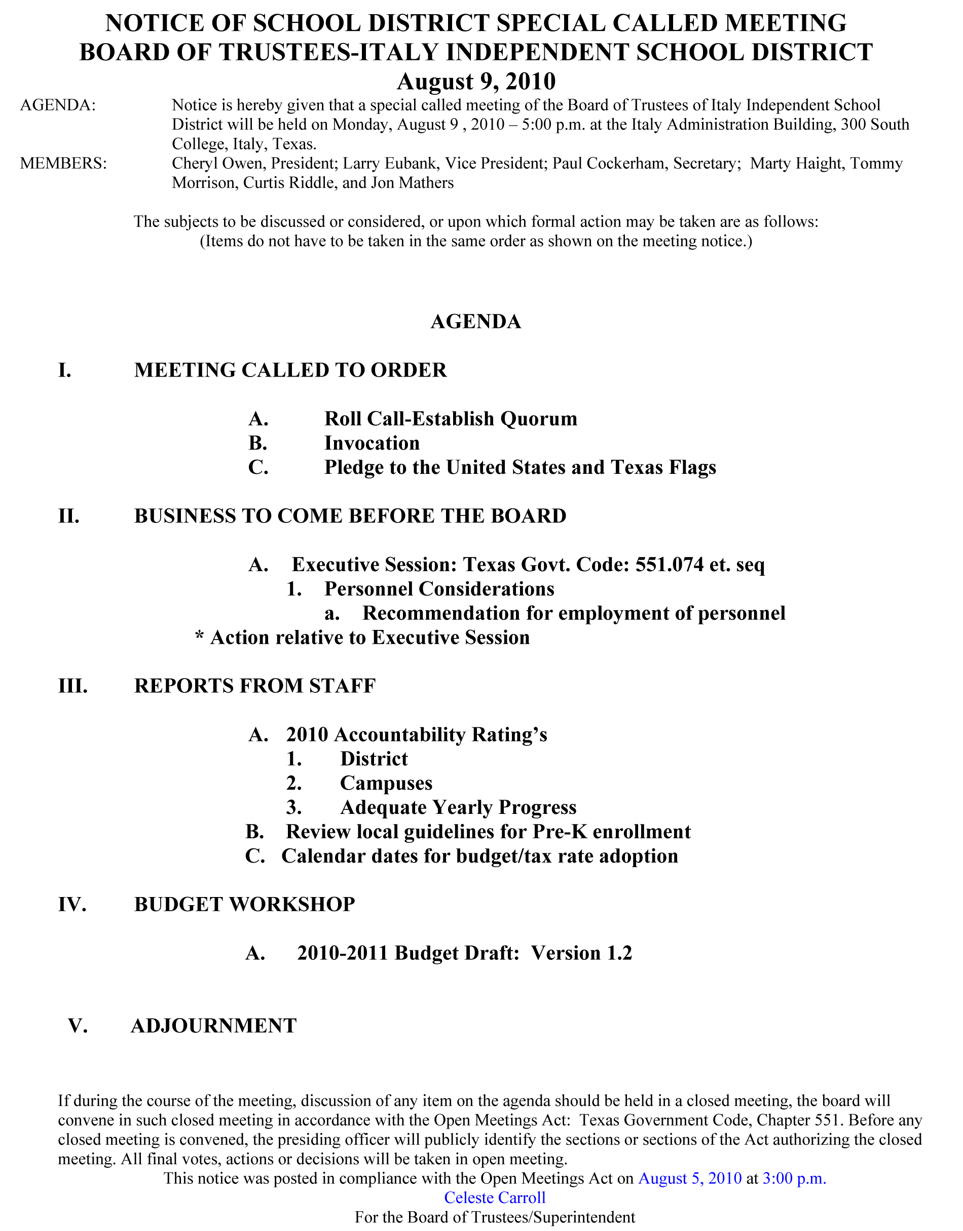 Agenda: Called Italy ISD School Board Meeting August 9, 2010 « previous story album next » Agenda Download original photo