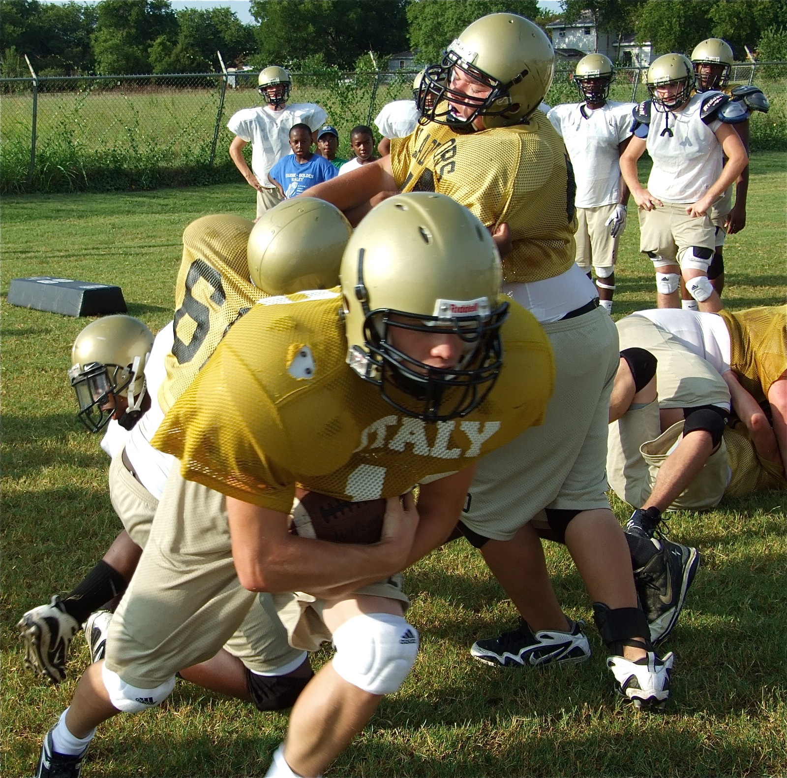 The Gladiators’ first day in full pads a smashing success « previous story album next » Squeezing thru — Kevin Roldan makes room for Chase Hamilton. (Barry Byers) Download original photo