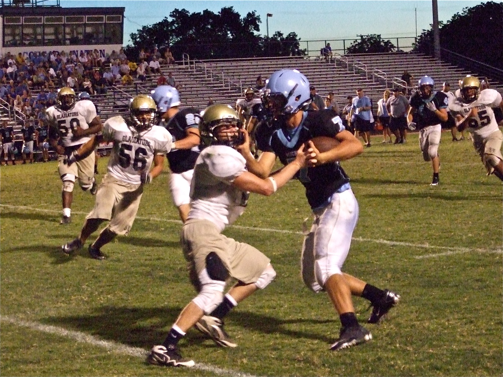 Illegal stiff-arm — Waco Reicher’s quarterback illegally grabs and twists the facemask of Italy’s Justin Buchanan but the referees missed the call. It’s all part of the game. (Barry Byers)