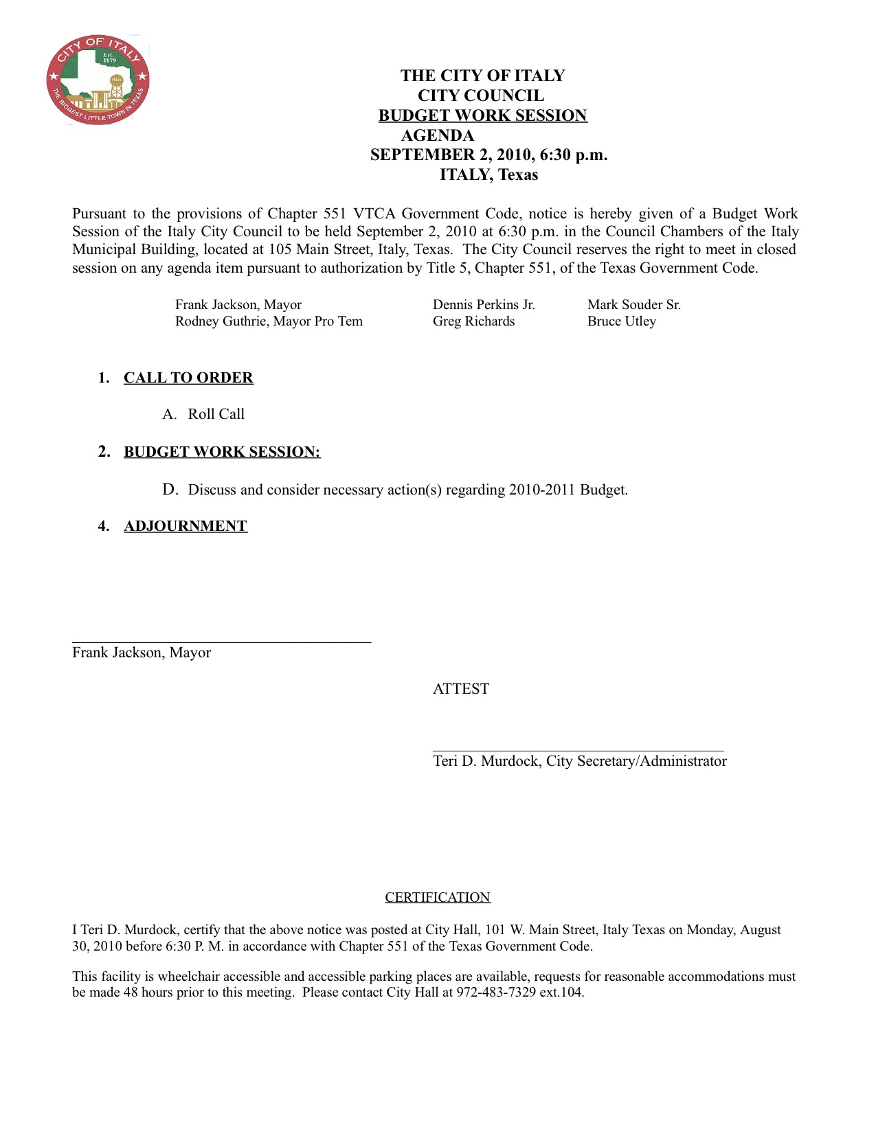 Agenda: Italy City Council Budget Work Session, September 2, 2010 « previous story album next » Agenda (www.ci.italy.tx.us) Download original photo