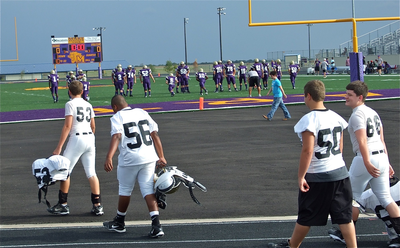 The Italy JV squad arrives to play the Mart Panthers — Italy’s Bailey Walton(52), Darol Mayberry(56), Zain Byers(50) and Jake Escamilla cross the track and head toward Mart’s turf field where the Panthers were eagerly awaiting their arrival on Thursday. (Barry Byers)