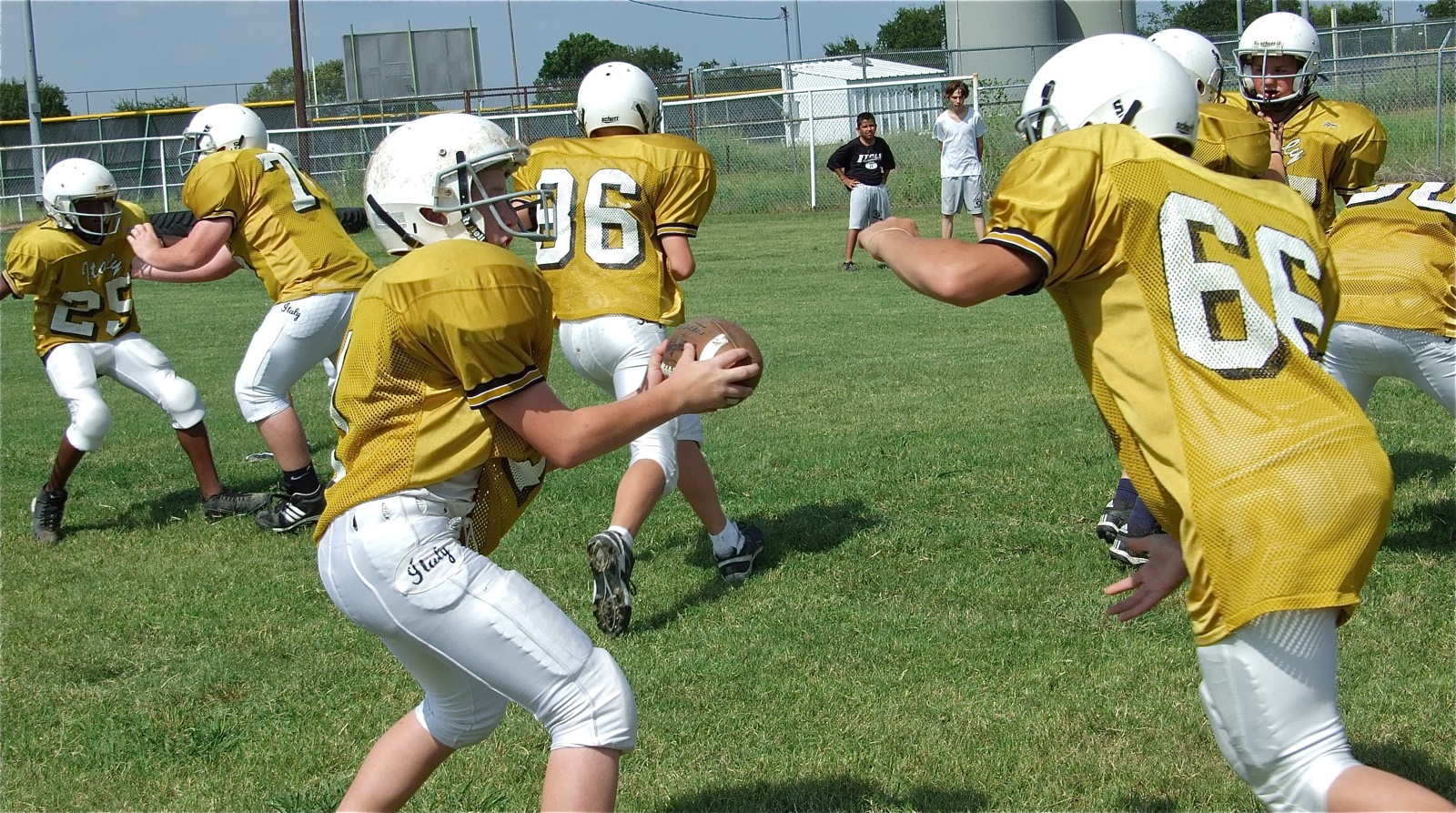 Heavy rains spare Palmer from Italy’s talented Junior High team — John Escamilla(1) hands off to Coby Bland(66) during Thursday’s practice. The Italy Junior High made the most of the day despite having their scrimmage against Palmer cancelled after heavy rains earlier in the week soaked Willis Field. (Barry Byers)
