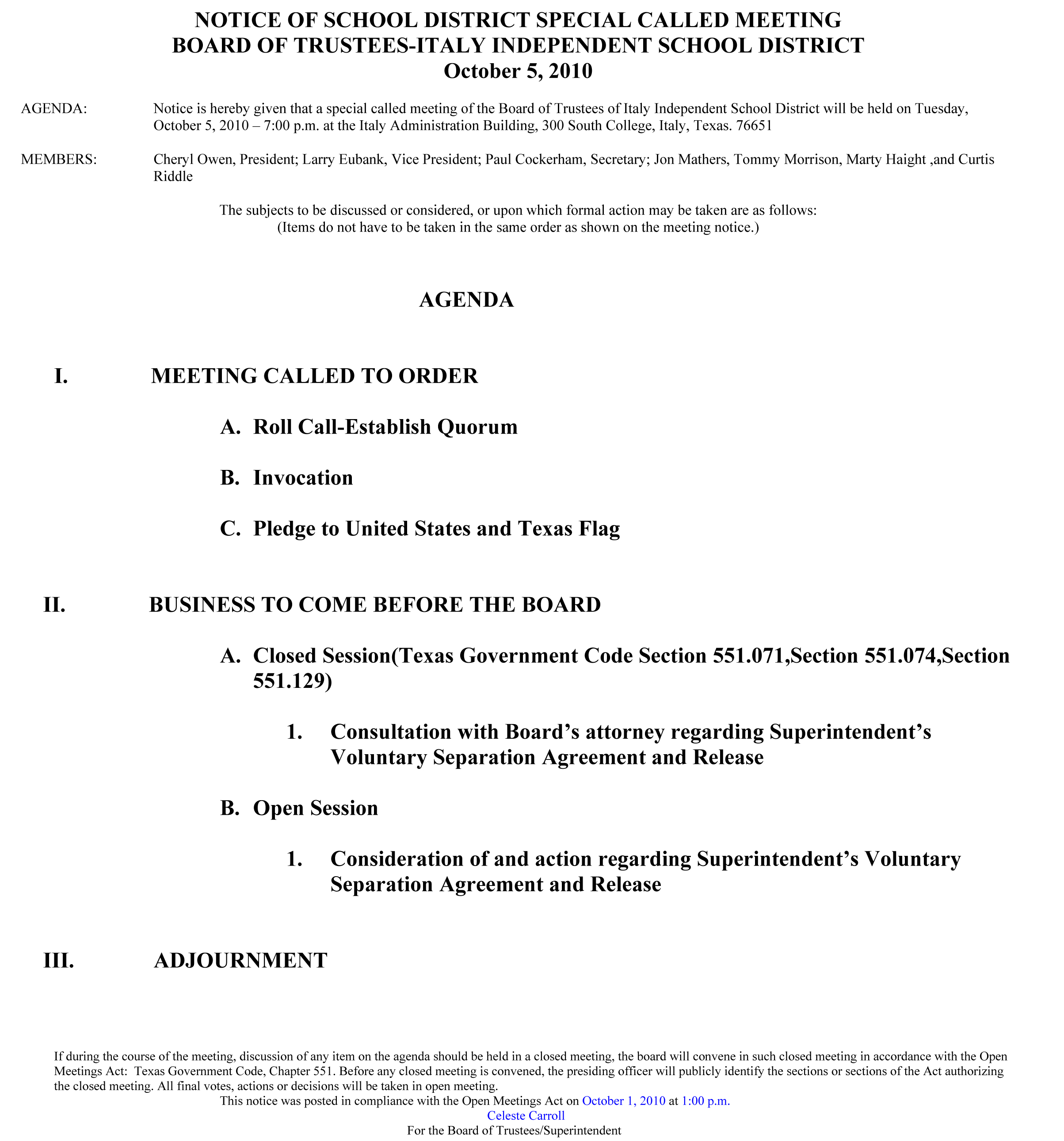 Agenda: Italy ISD School Board Called Meeting, October 5, 2010 « previous story album next » Agenda Download original photo