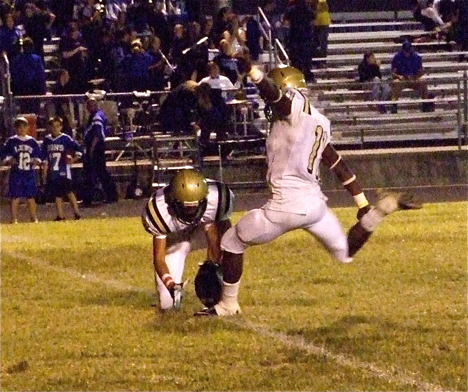 Gladiators win fourth straight to start 1-0 in district « previous story album next » The point after — Jase Holden(6) holds for kicker Jasenio Anderson(11) during the point after kick. (Barry Byers) Download original photo