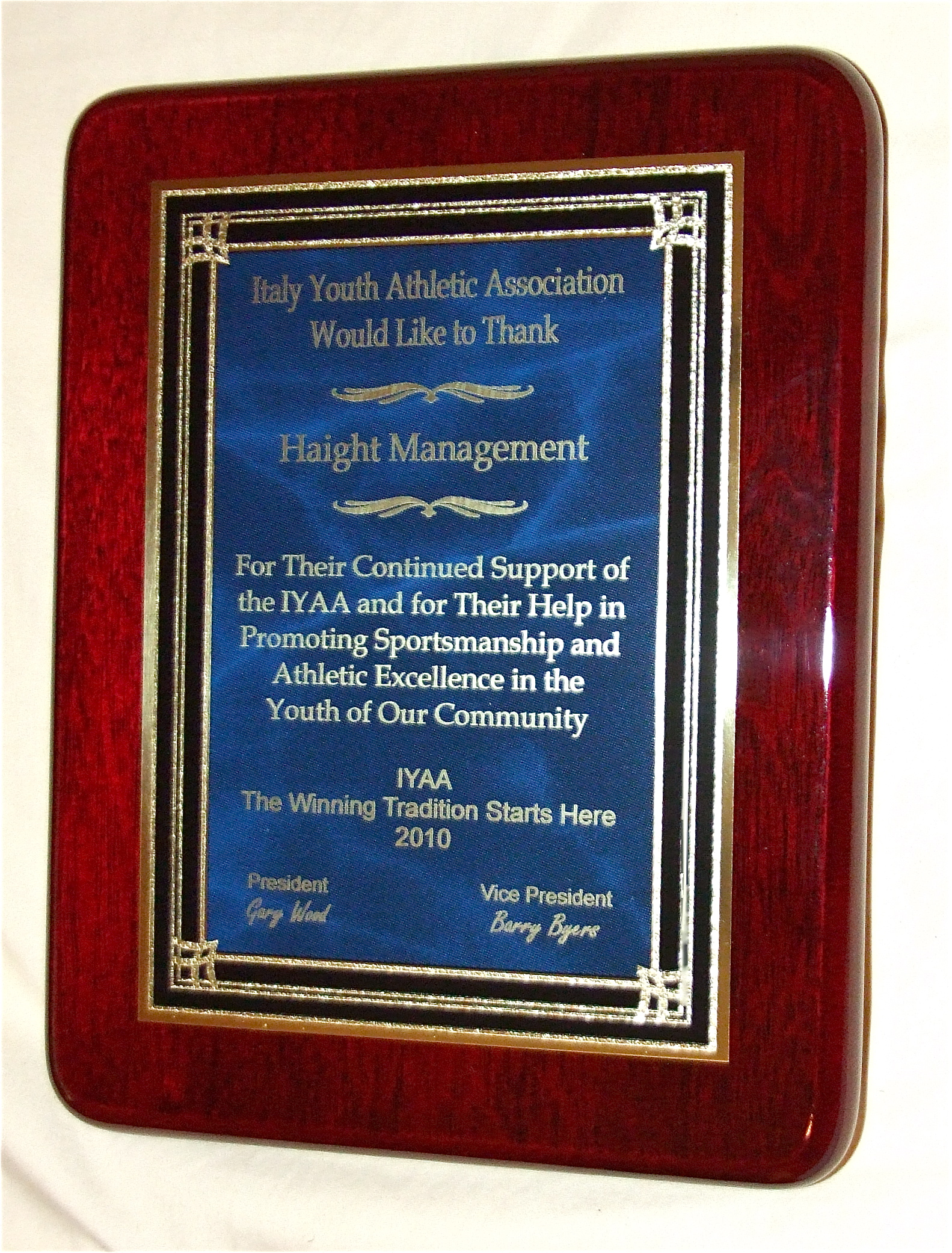 Appreciation plaque — A closer view of the appreciation plaques the IYAA presented sponsors during the month of October. This plaque was given to Tina and Marty Haight of Haight Construction Management Services.