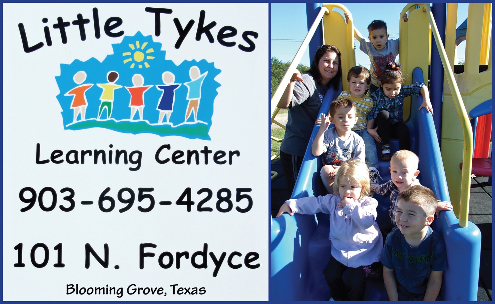 Little Tykes Learning Center in Blooming Grove is accepting enrollments — Little Tykes Learning Center, located in Blooming Grove is professionally staffed with teachers certified in CPR. Hours of operation are M-F 6:30 a.m. to 6:00 p.m. Contact Little Tykes today to arrange quality and caring day care for your little tyke: 903-695-4285.