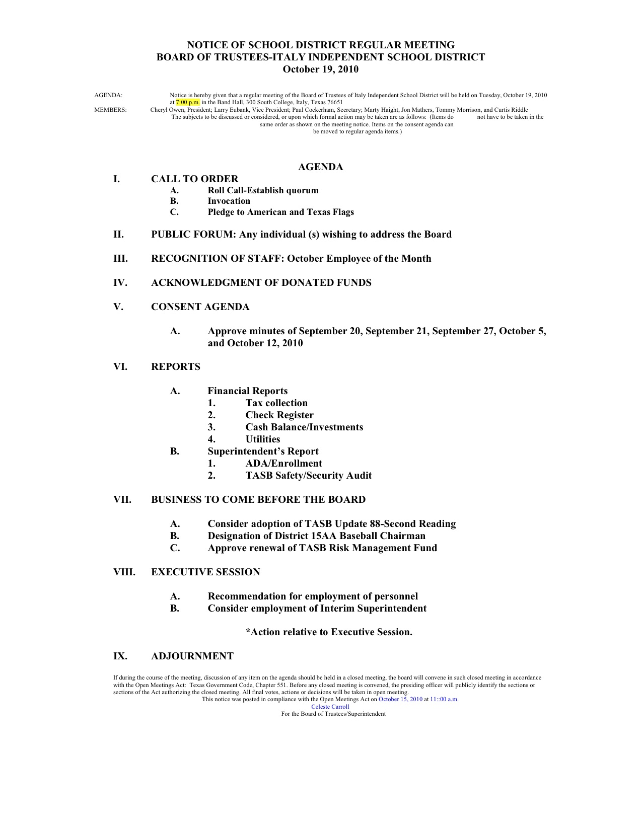 Agenda: Italy ISD School Board Meeting, October 19, 2010 « previous story album next » Agenda Download original photo