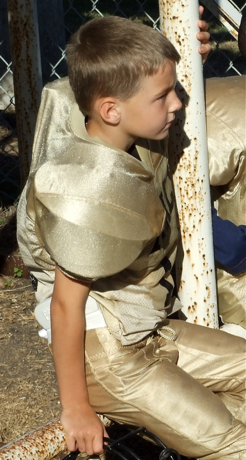 Taylor Sparks — IYAA C-Team Gladiators’ offensive lineman Taylor Sparks(1) takes a moment to relax at halftime while Sparks and his offensive line comrades receive praise from their head coach on a well blocked first half. (Barry Byers)