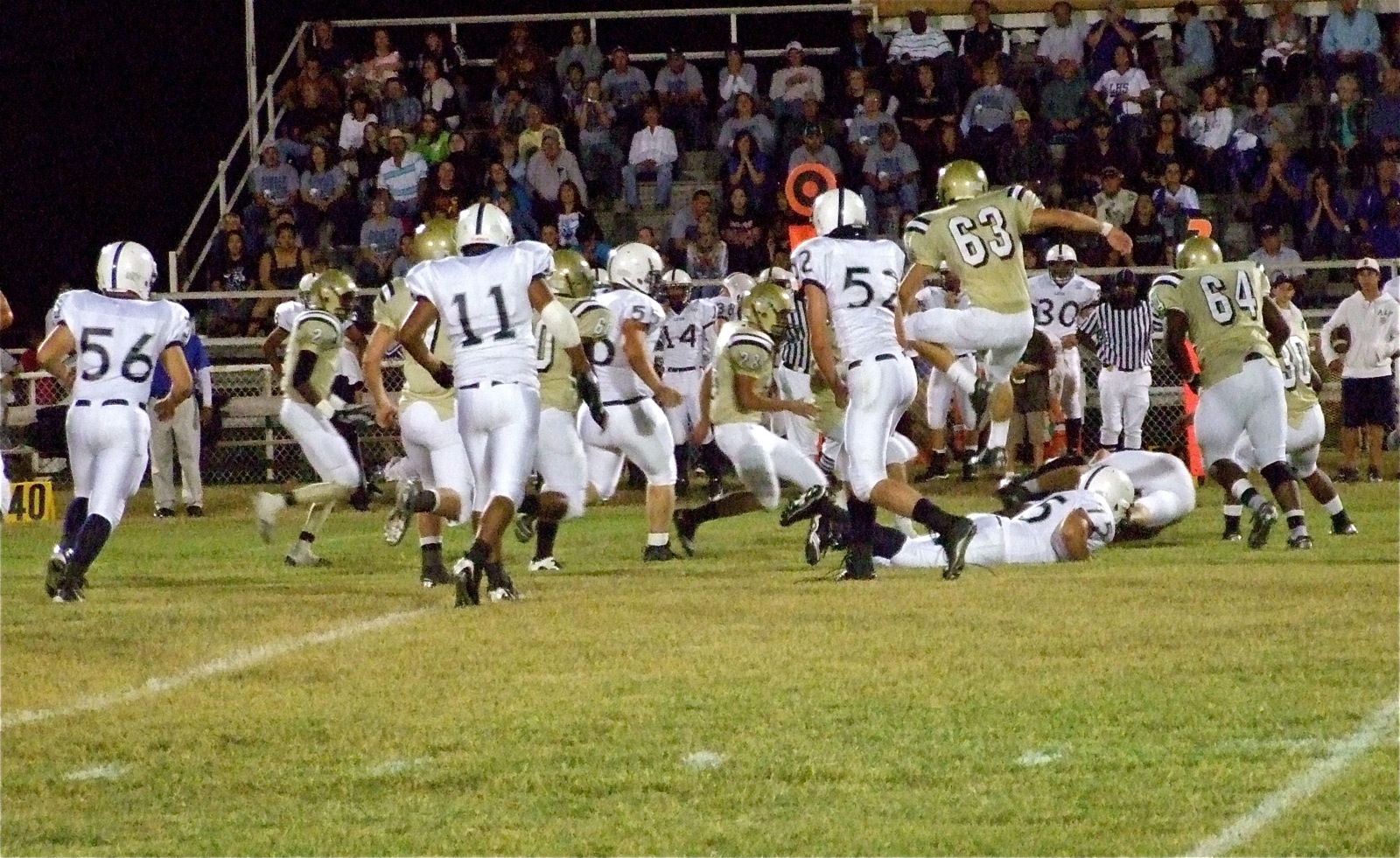 Gladiators converge — Gladiators Heath Clemons(2), Kyle WIlkins(7), De’Andre Rettig(60), Kyle Jackson(28), Brandon Souder(63), Bobby Wilson(64), Jamal Jalarnce Lewis(30) hustle to the ball. (Barry Byers)