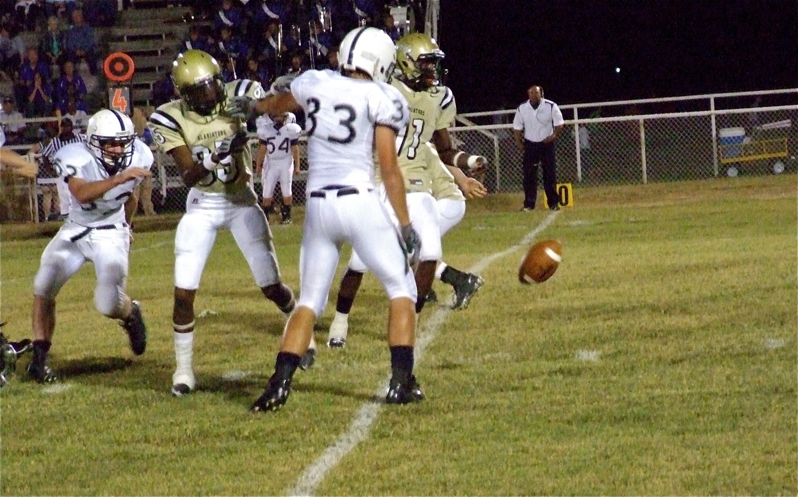 Cougars pounce back, overtake Gladiators in final quarter « previous story album next » Punt blocked — The Leon Cougars block a Jasenio Anderson(11) punt and Leon’s Drake Jones(33) recovers at the Gladiator 30-yard line. (Barry Byers) Download original photo