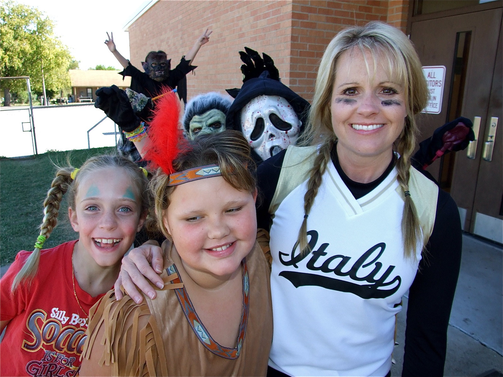Happy Halloween from Italy High School and Stafford Elementary « previous story album next » Back to gule! — Stafford Elementary teacher Kim Nelson looks scared as she is suddenly surrounded by creepers and little monsters. (Barry Byers) Download original photo