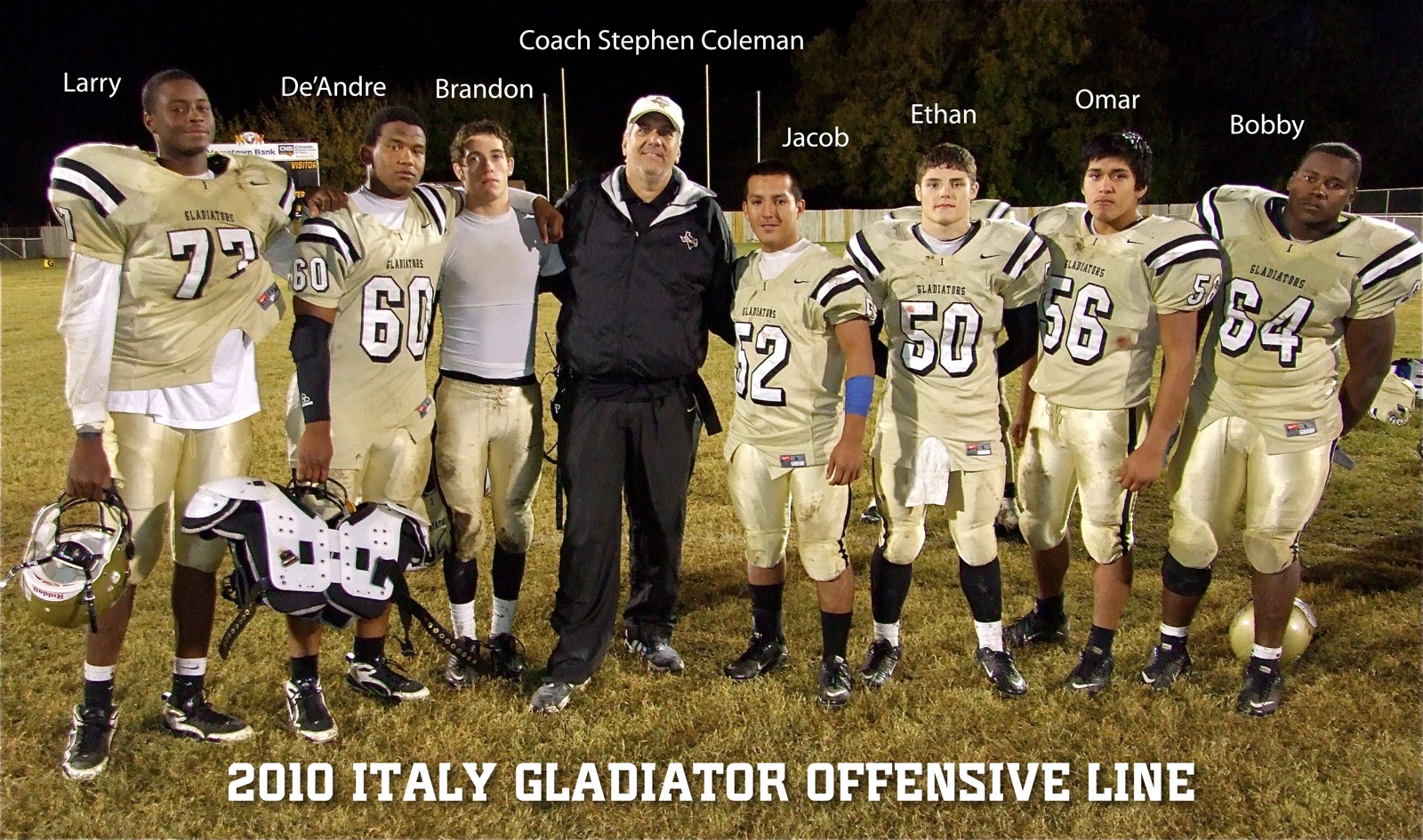 Bonds formed — Italy’s line coach, Stephen Coleman, is pictured with his offensive line consisting of Larry Mayberry(77), De’Andre Rettig(60), Brandon Souder(63), Jacob Lopez(52), Ethan Simon(50), Omar Estrada(56) and Bobby Wilson(64). (Barry Byers)