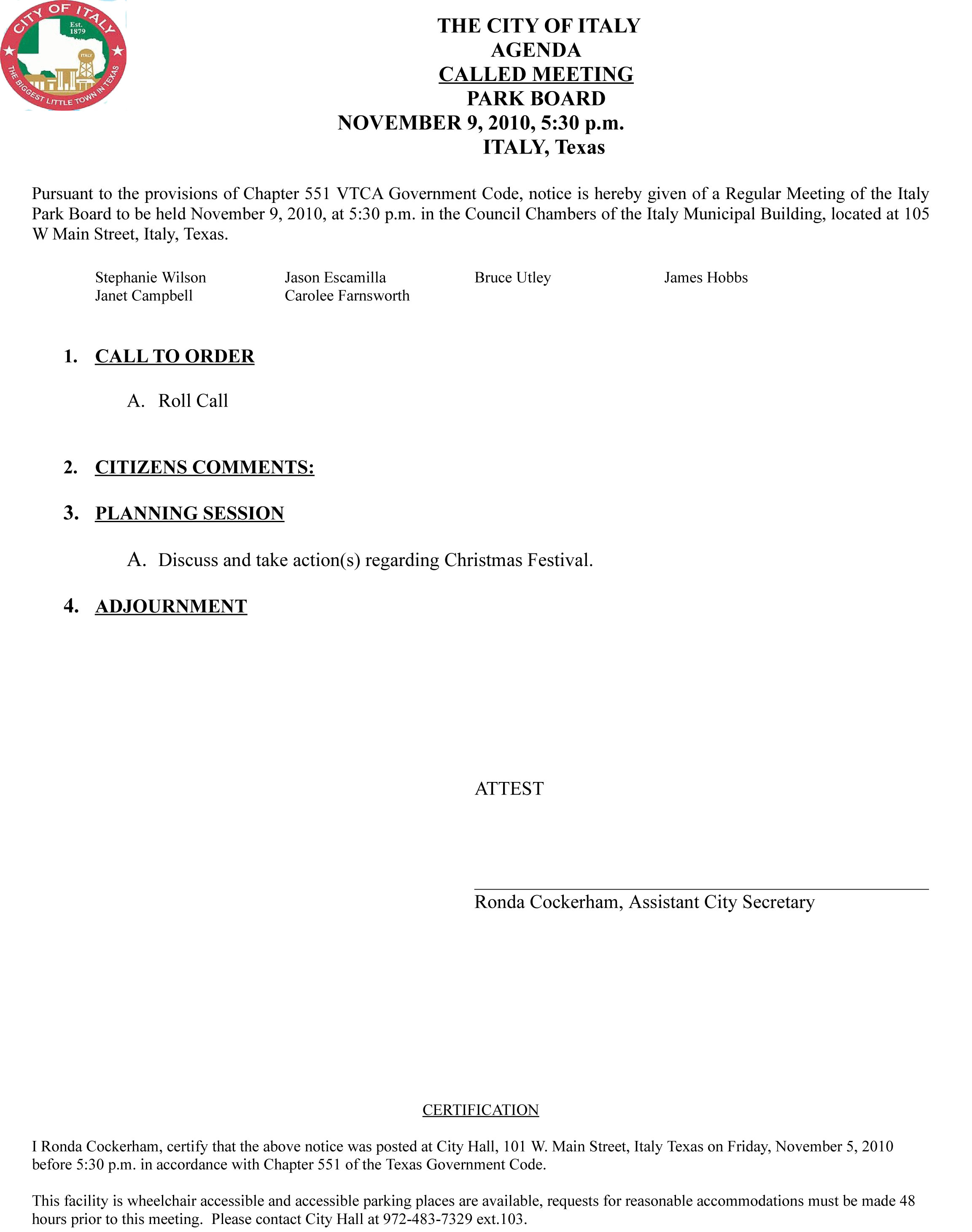 Agenda: Italy Park Board Meeting, November 9, 2010 « previous story album next » Agenda Download original photo