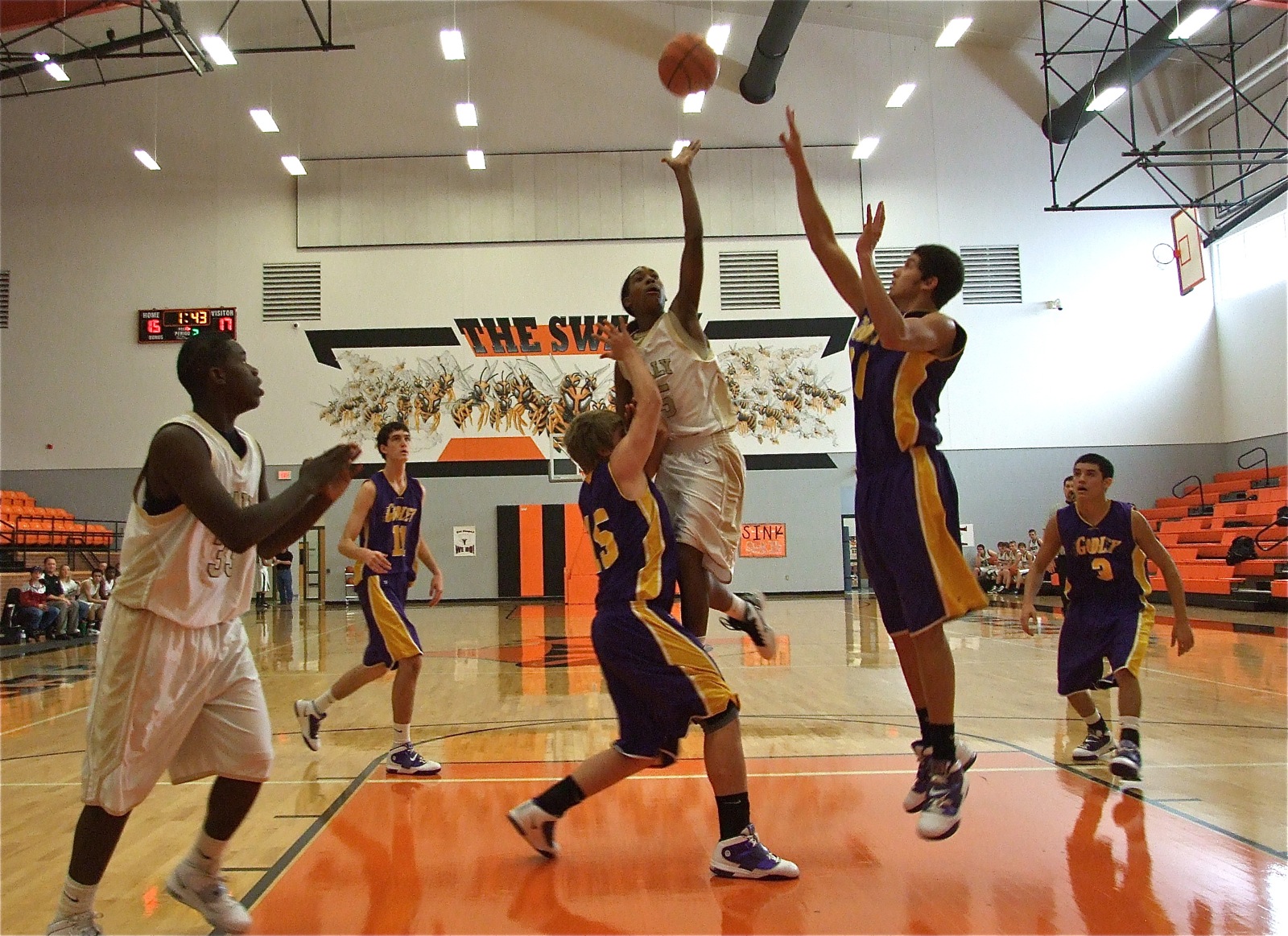 Trevon Robertson(15) goes over the top as Italy’s JV team — Italy’s Trevon Robertson(15) attacks the middle of the lane against Godley while T.J. Cockran gets in position to grab a board. The Italy JV Gladiators won 3-out-of-4 games to finish in 3rd place during the Ferris JV Tournament. (Barry Byers)