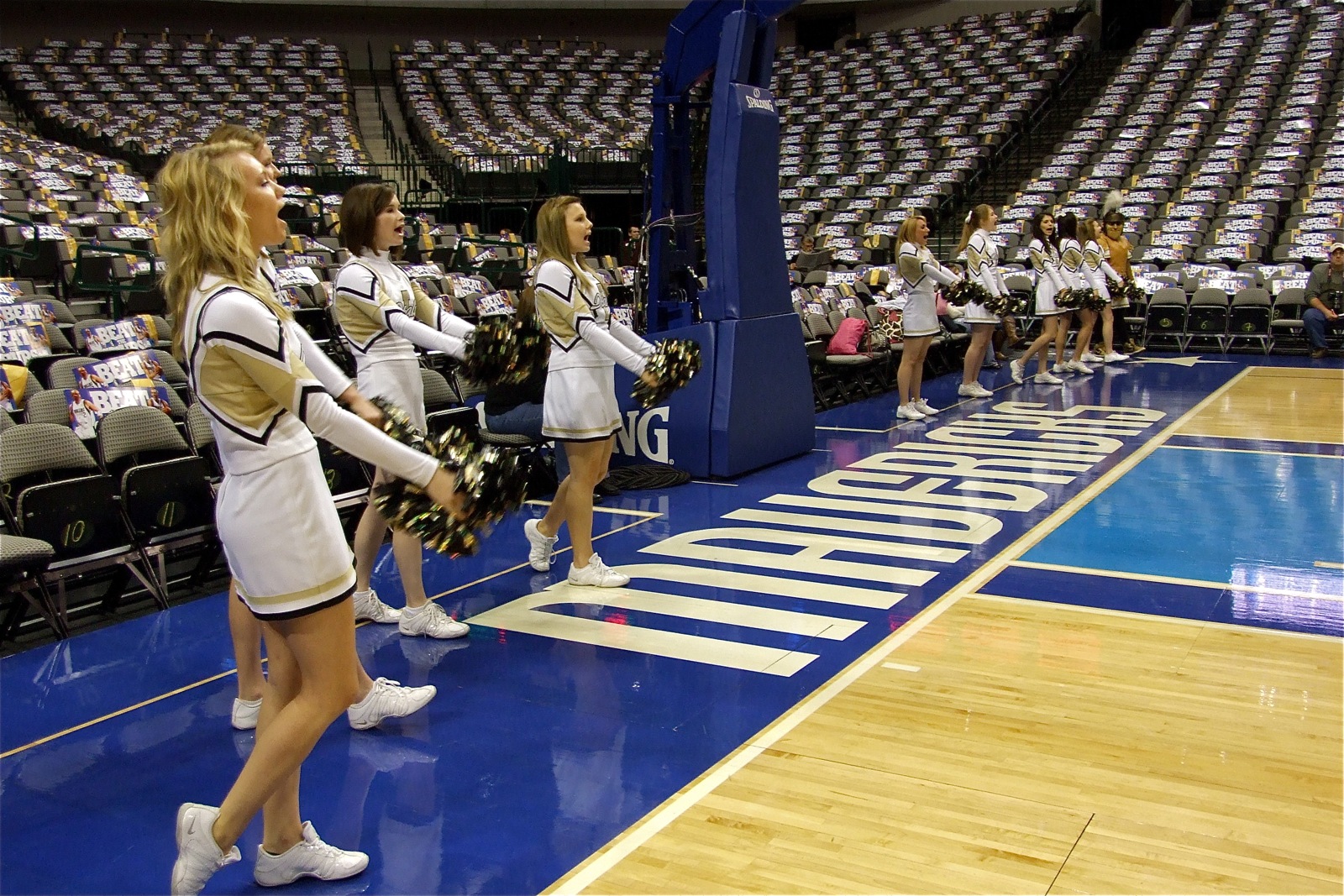 Image: Cheerleaders cheering — The IHS cheerleaders keep the cheers coming from under the basket inside the AAC.