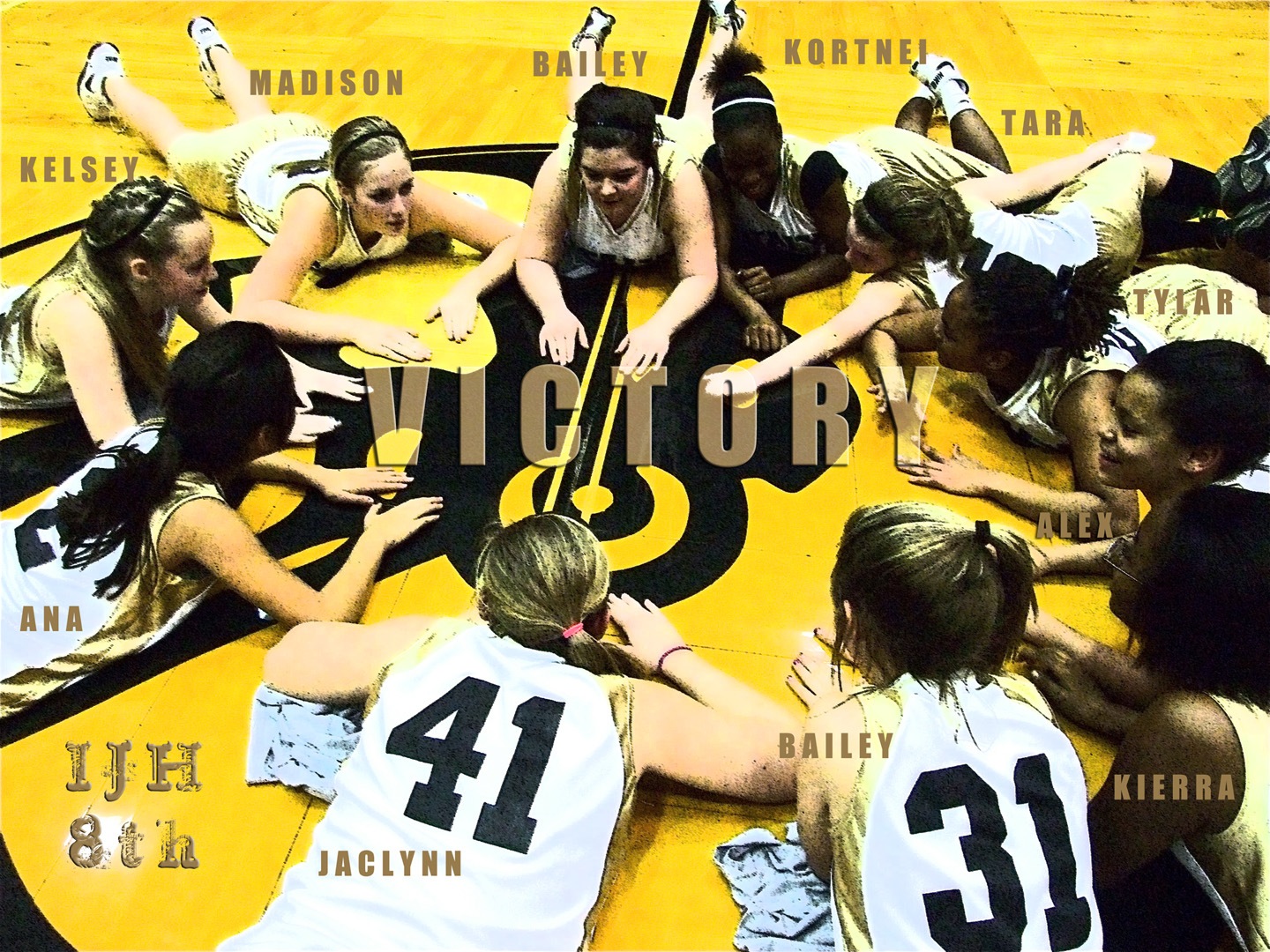 Victory starts here — Italy’s 8th Grade Junior High Girls form a victory circle atop the Gladiator head located at center court inside Italy Coliseum after a big win over Rio Vista, 35-20. (Barry Byers)