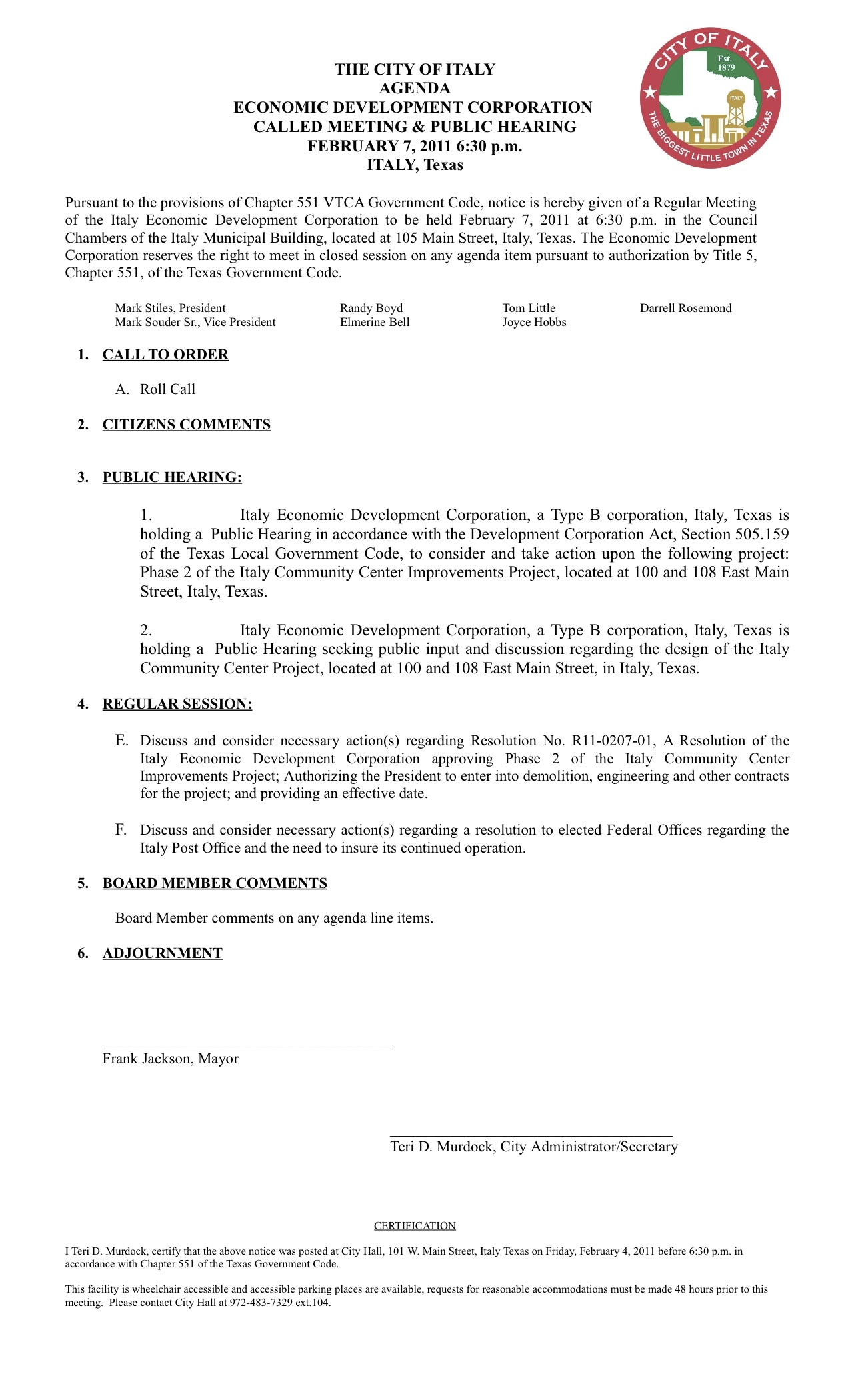 Agenda: Italy EDC Called Meeting and Hearing, February 7, 2011 « previous story album next » Agenda (www.ci.italy.tx.us) Download original photo