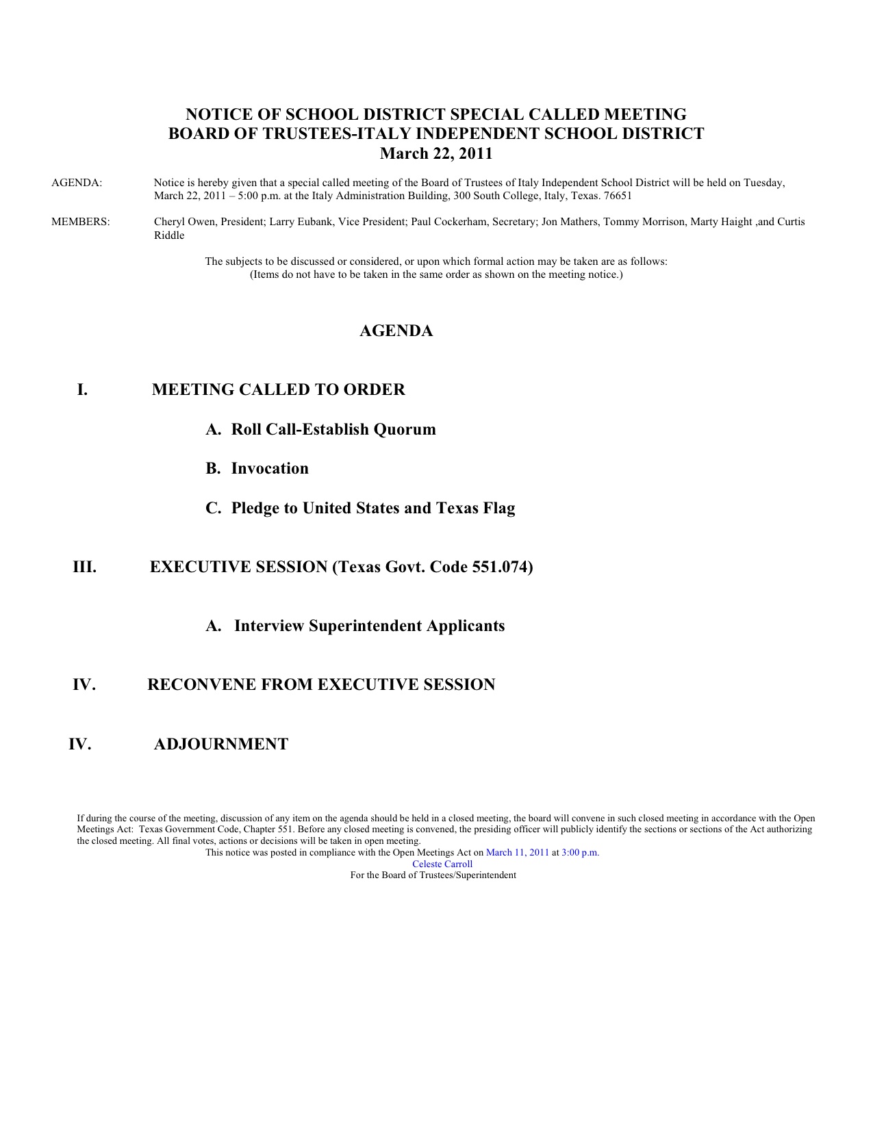 Agenda: ItalyISD School Board Called Meetings, March 22-23-24, 2011 « previous story album next » March 22 Agenda Download original photo