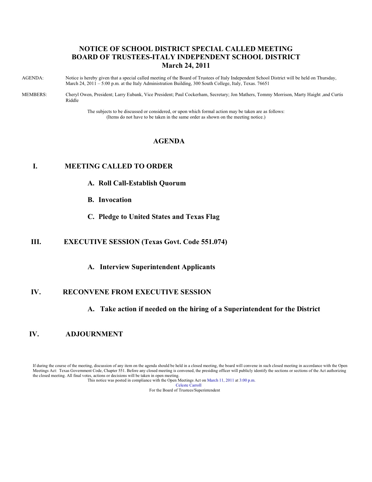 Agenda: ItalyISD School Board Called Meetings, March 22-23-24, 2011 « previous story album next » March 24 Agenda Download original photo