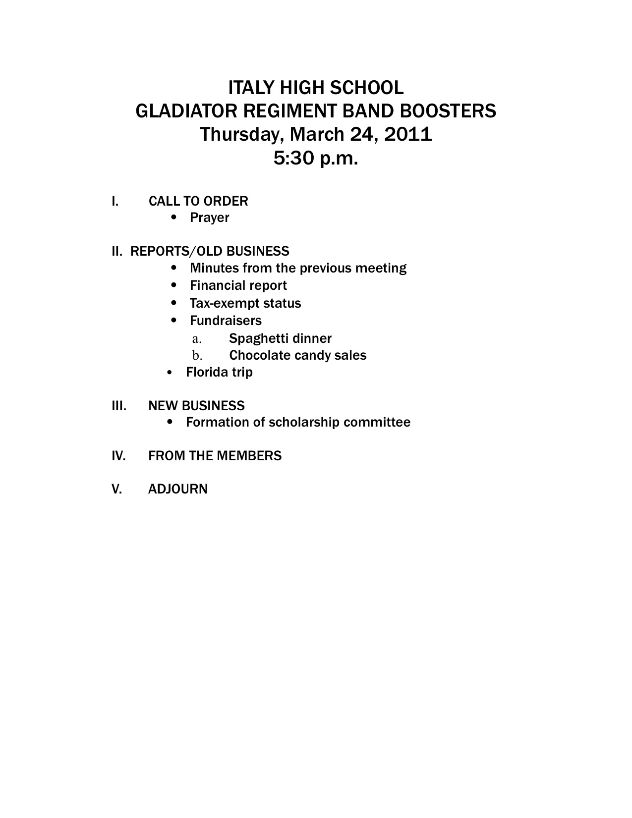 Agenda: Gladiator Regiment Band Boosters Meeting, March 24, 2011 « previous story album next » Download original photo