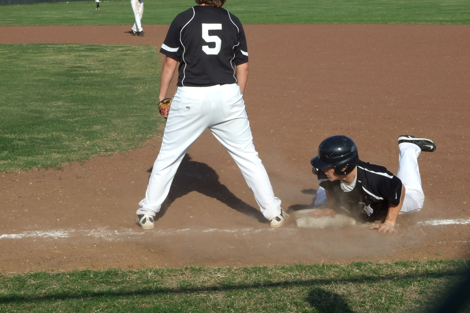 Gladiator Baseball « previous story album next » Chase is safe — Tempting the pitcher a bit, Chase Hamilton returns to first before the ball gets there. (Anne Sutherland) Download original photo