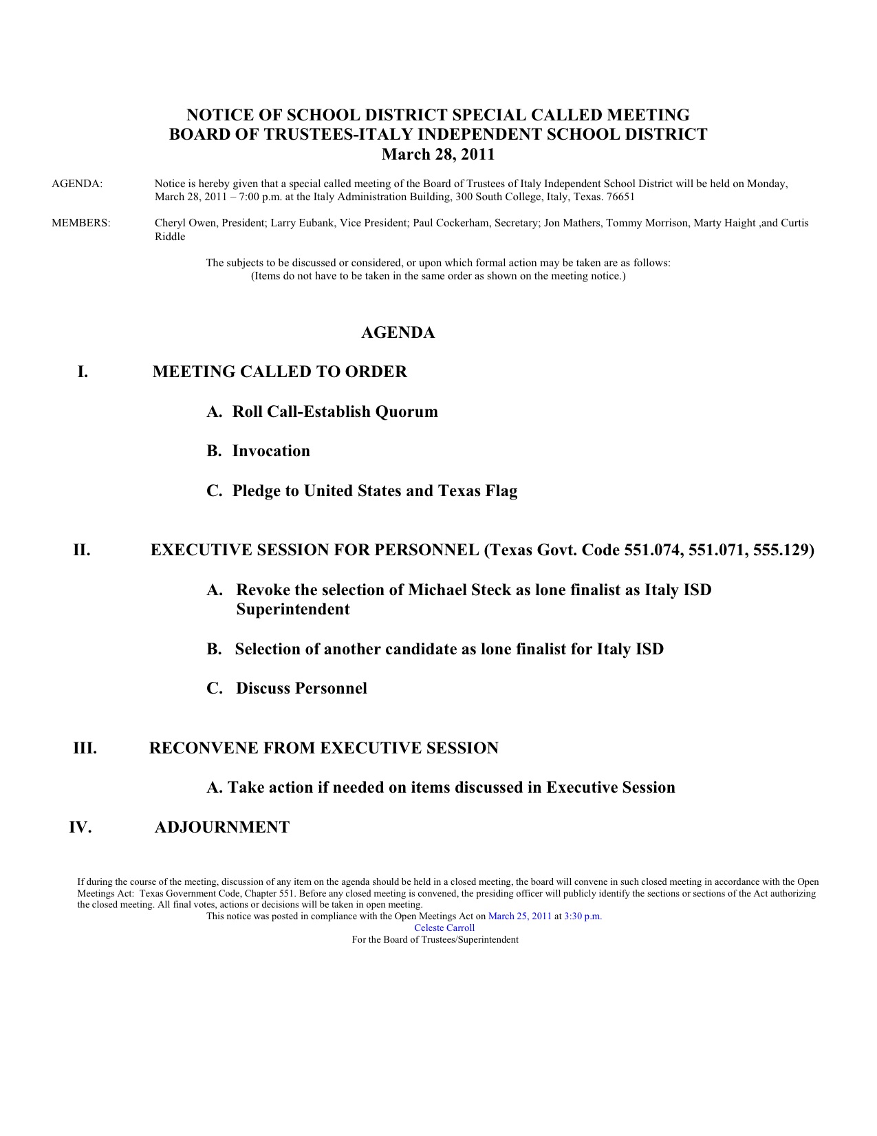 Agenda: Italy ISD School Board Called Meeting, March 28, 2011 « previous story album next » Agenda Download original photo