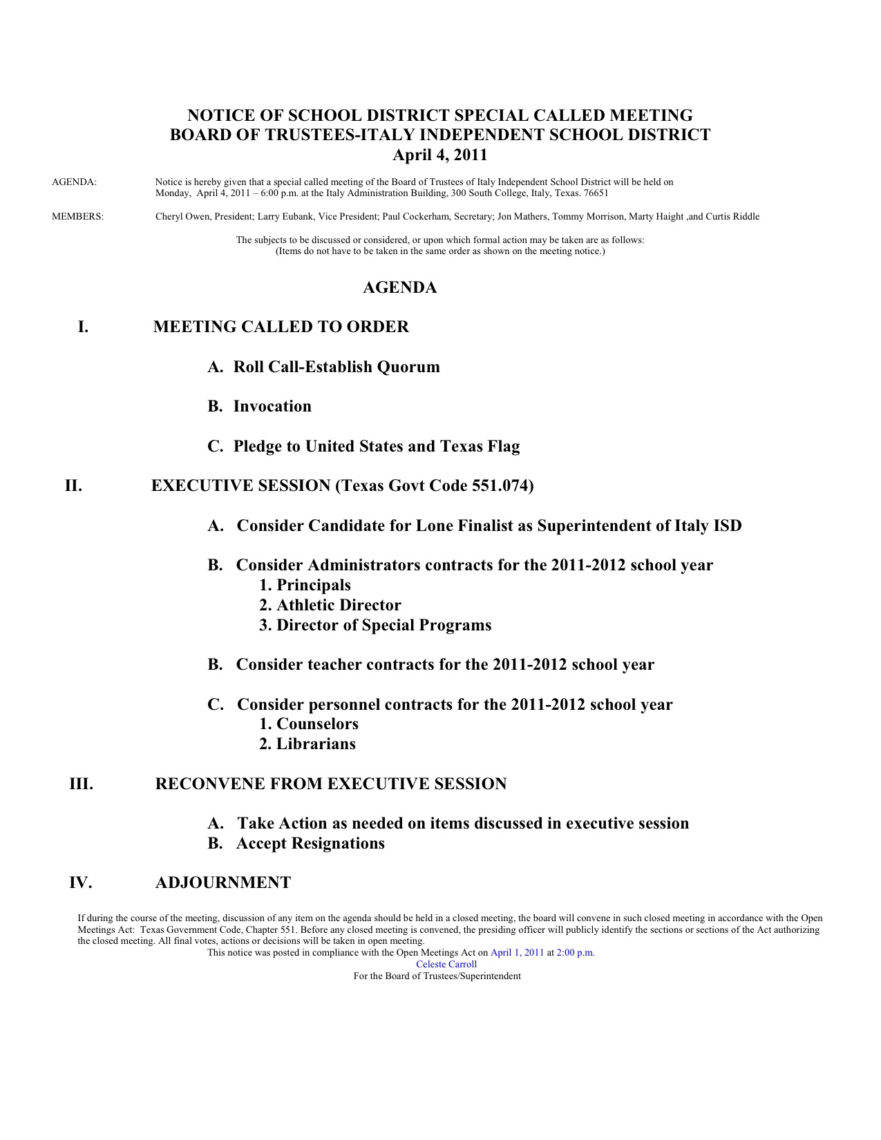 Agenda: Italy ISD School Board Called Meeting, April 4, 2011 « previous story album next » Download original photo