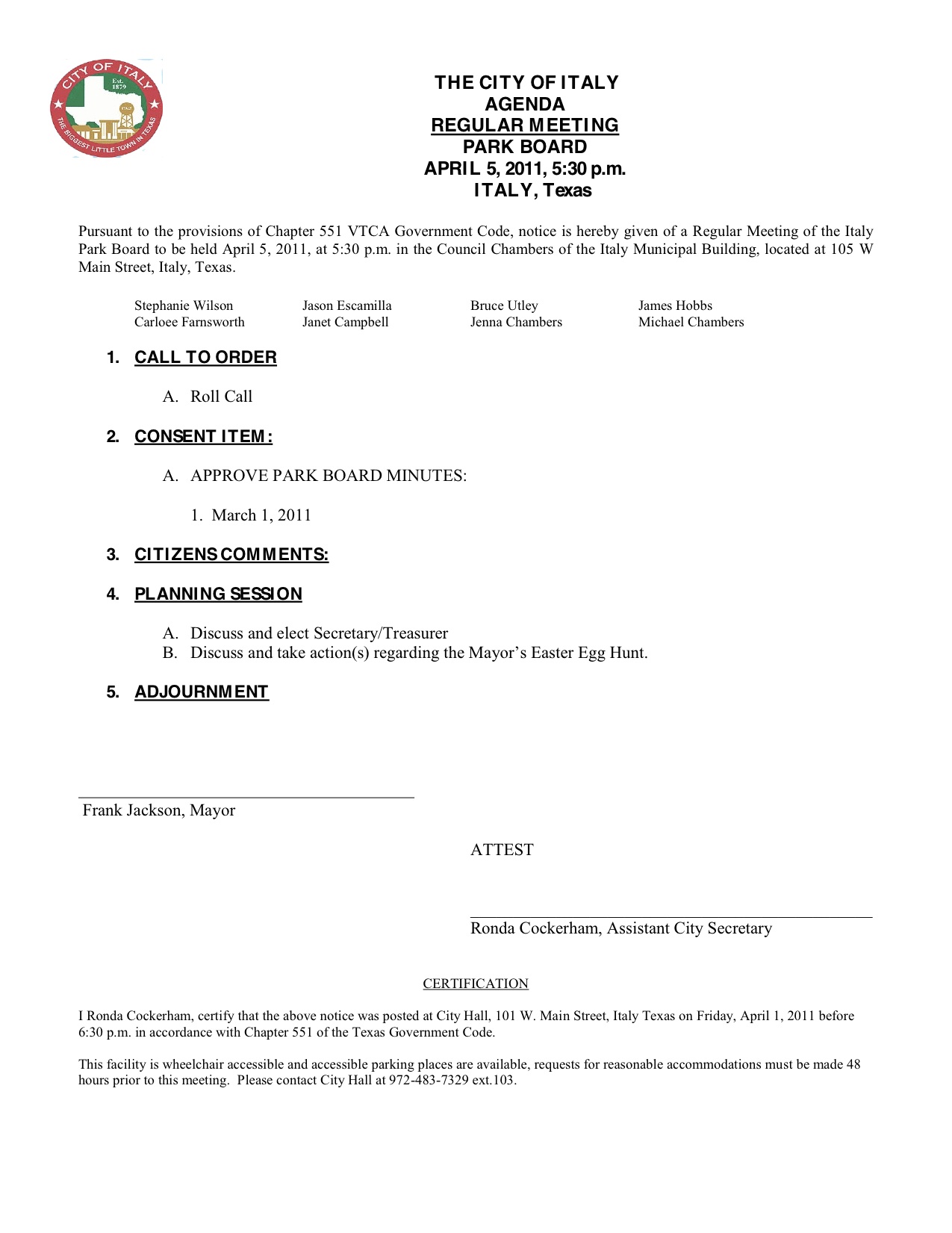 Agenda: Italy Park Board Meeting, April 5, 2011 « previous story album next » Download original photo
