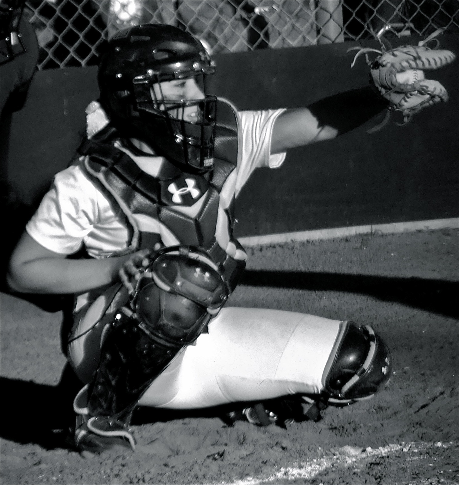Lady Gladiators win 3-of-5 and stand alone in 3rd place « previous story album next » Behind the plate — Alyssa Richards holds onto a strike from sister, Megan Richards. (Barry Byers) Download original photo