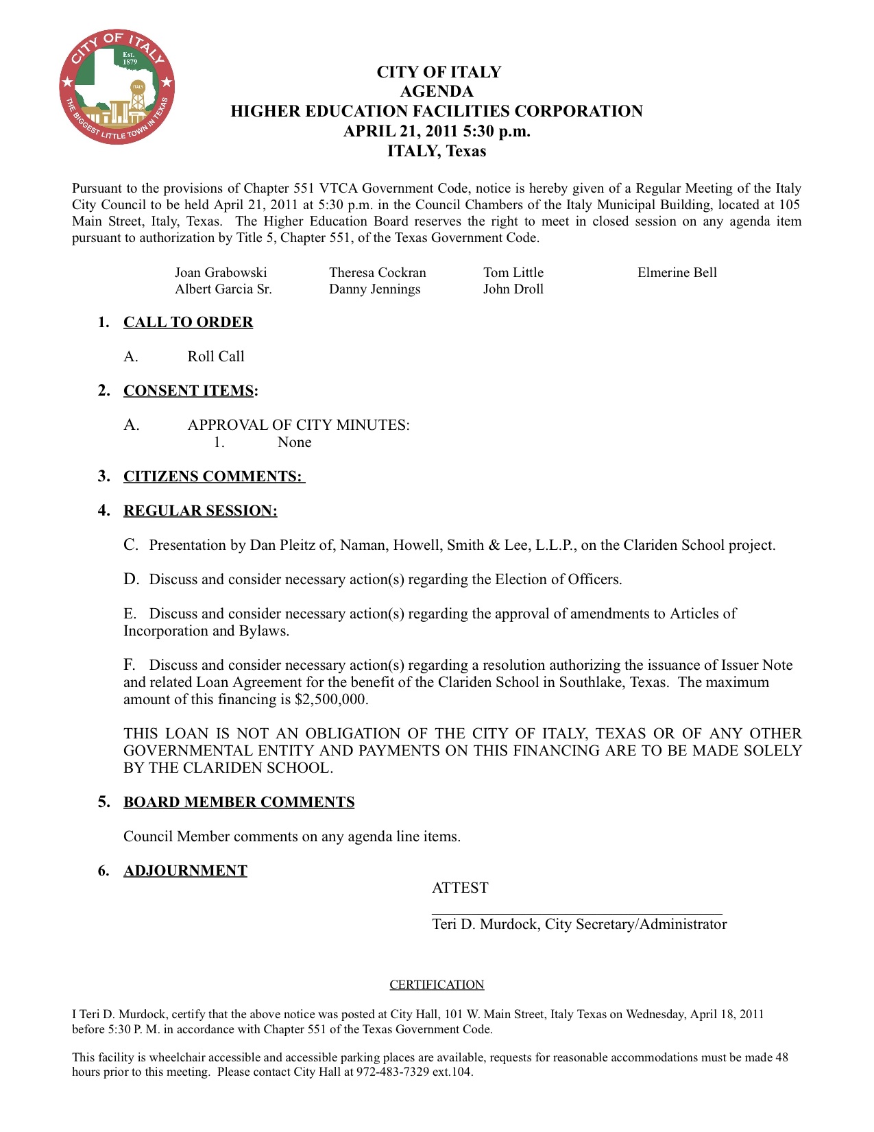Agenda: Higher Education Facilities Corporation, April 21, 2011 « previous story album next » Agenda Download original photo