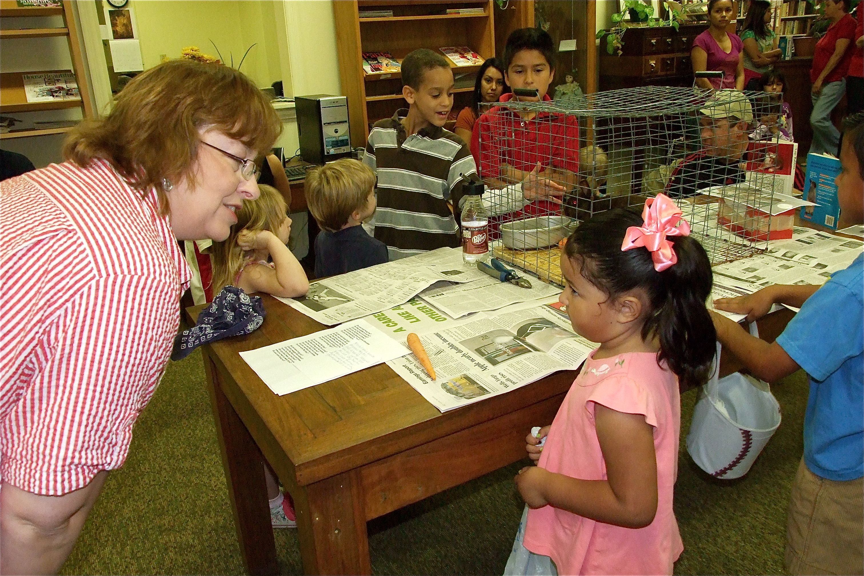 Local Library Hosts Egg Hunt « previous story album next » Easter is educational — Why do bunnies have pink eyes? Anne Sutherland answers questions regarding her bunny, Sparkle, before the Easter Egg hunt. (Barry Byers) Download original photo