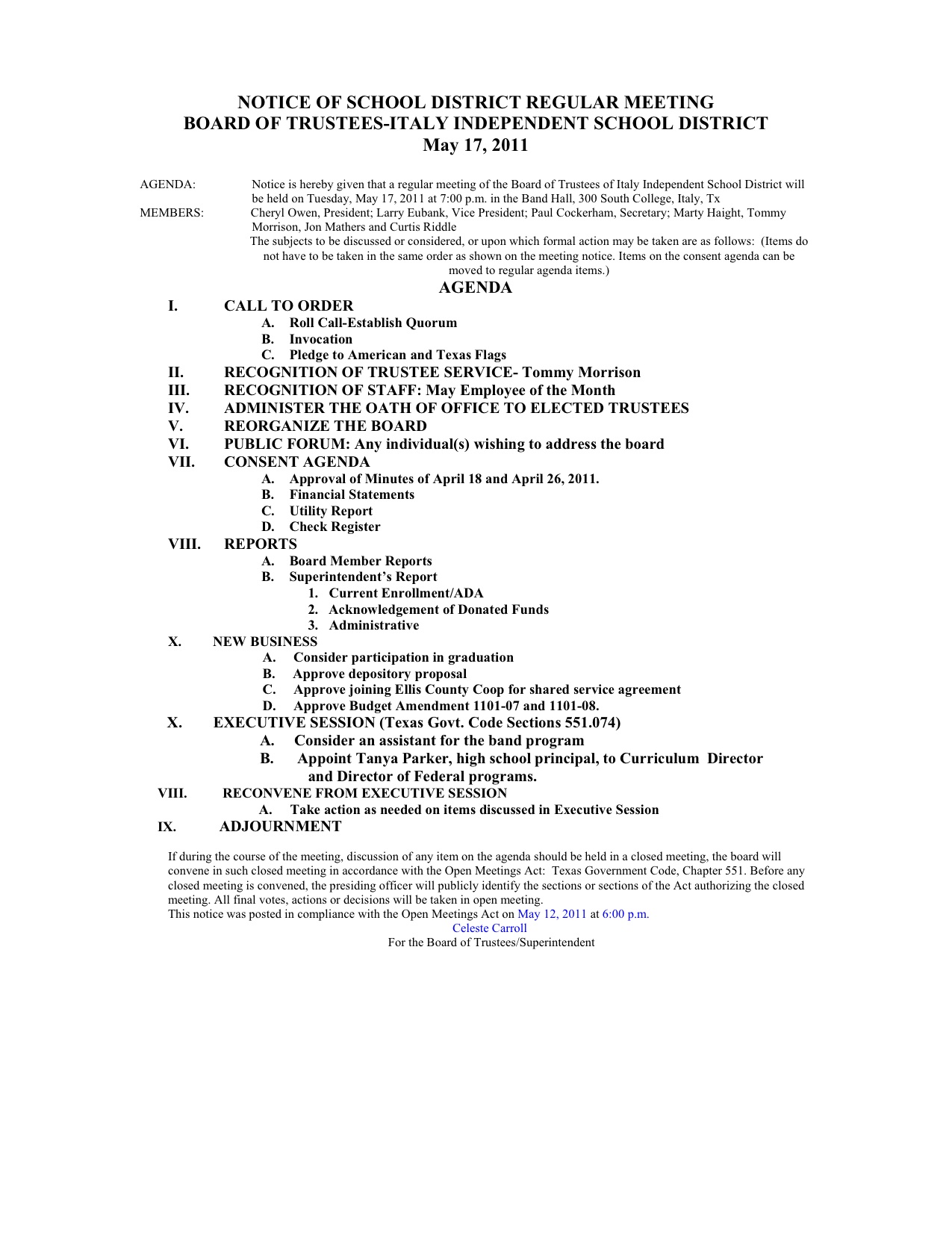 Agenda: Italy ISD School Board Meetings, May 17, 2011 « previous story album next » Agenda 7:00pm Download original photo
