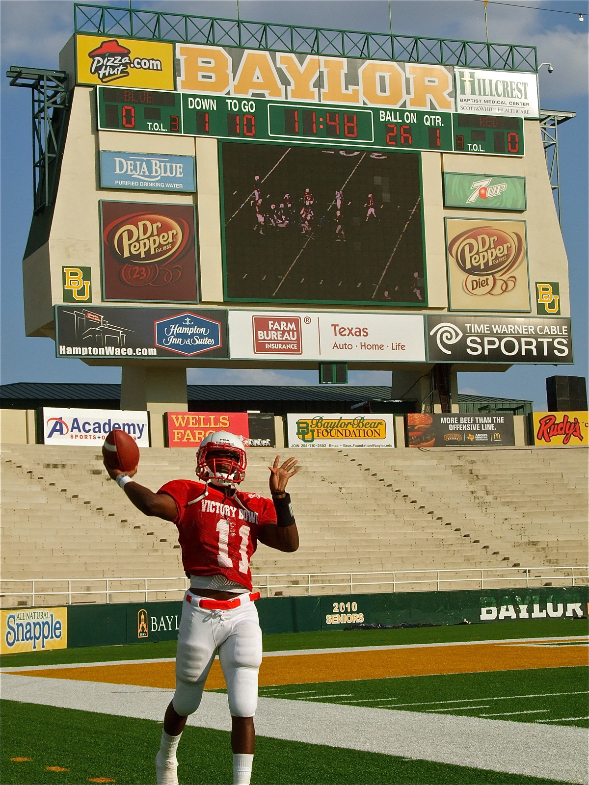 Jasenio Anderson(11) kicks off to start the 2011 FCA Victory Bowl and then hustles back to the sideline to throw practice passes with the Baylor scoreboard in the background. (Barry Byers)