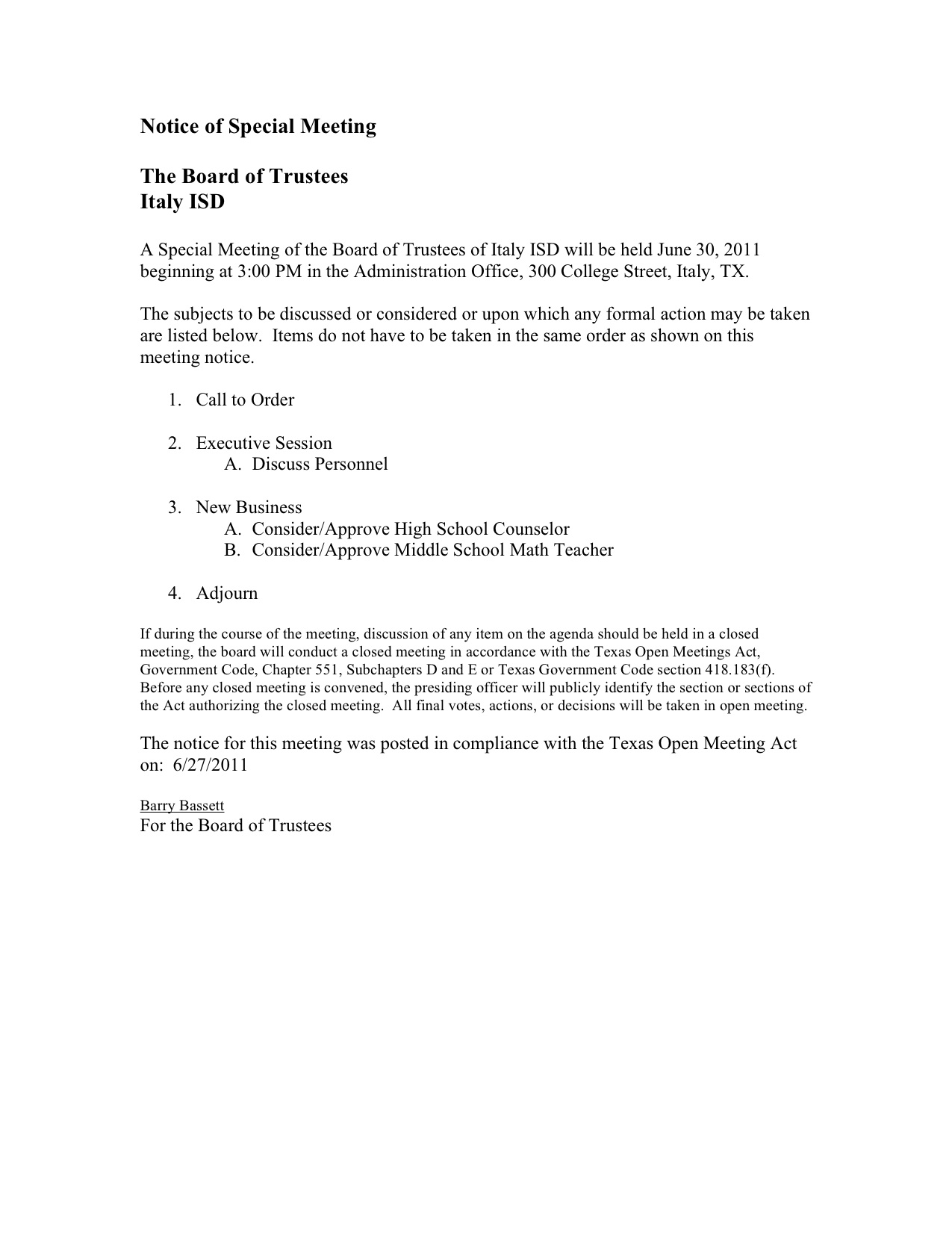 Agenda: Italy ISD School Board Special Meeting, June 30, 2011 « previous story album next » Download original photo