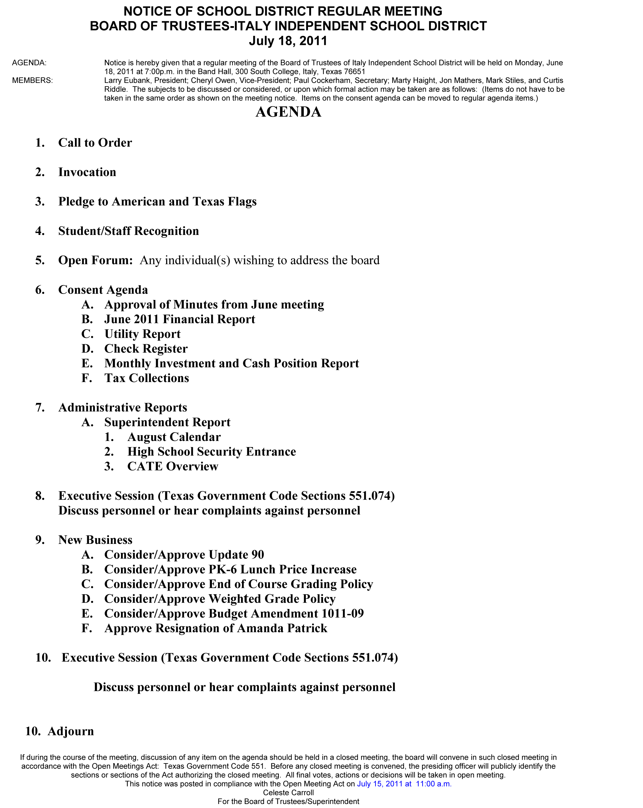 Agenda: Italy School Board Meeting—Monday, July 18, 2011 « previous story album next » Download original photo