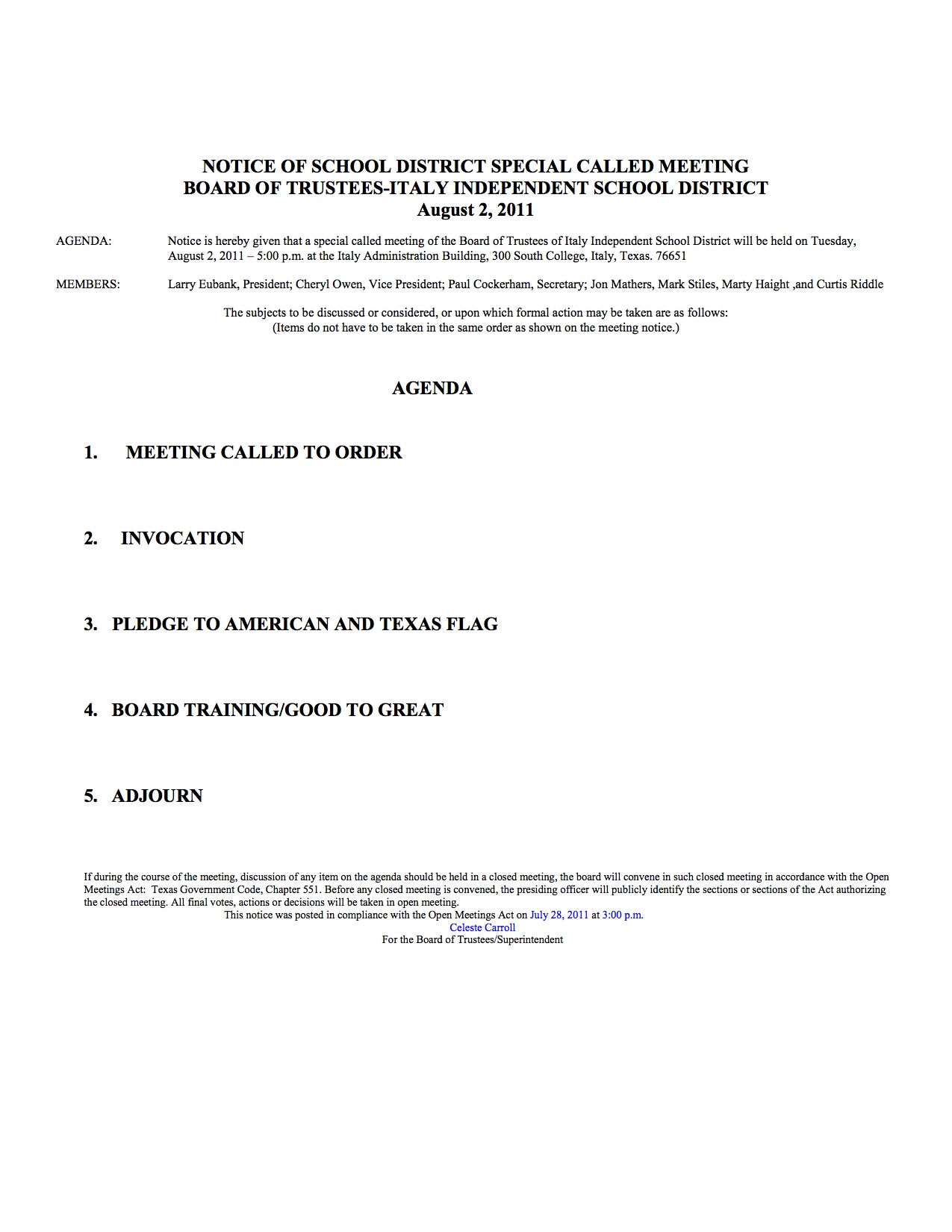 Agenda: Italy ISD School Board Called Meeting, August 2, 2011 « previous story album next » Download original photo