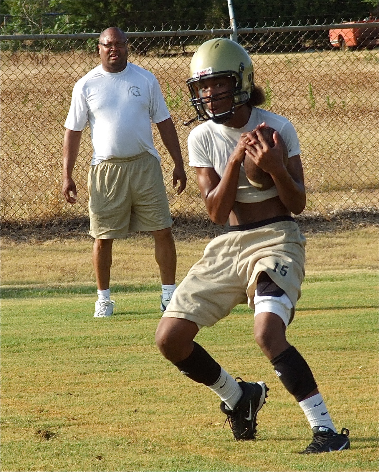 Gladiators begin 2-a-day workouts with confidence « previous story album next » Coach Larry Mayberry, Sr. looks on as Trevon Robertson hauls in a pass. (Barry Byers) Download original photo
