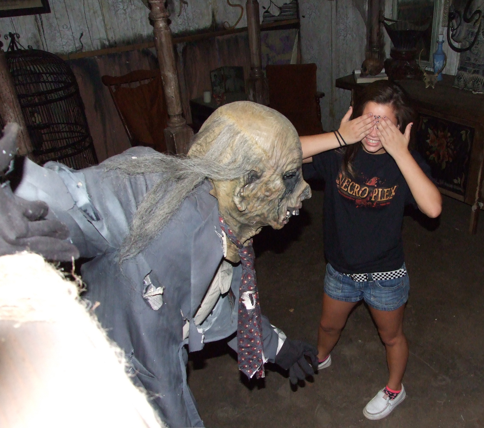 Local Haunted House Ready To Scare « previous story album next » Corl McCarthy, volunteer actor for the Necroplex, is scared of the ghoulish figure hovering over the doorway. (Anne Sutherland) Download original photo