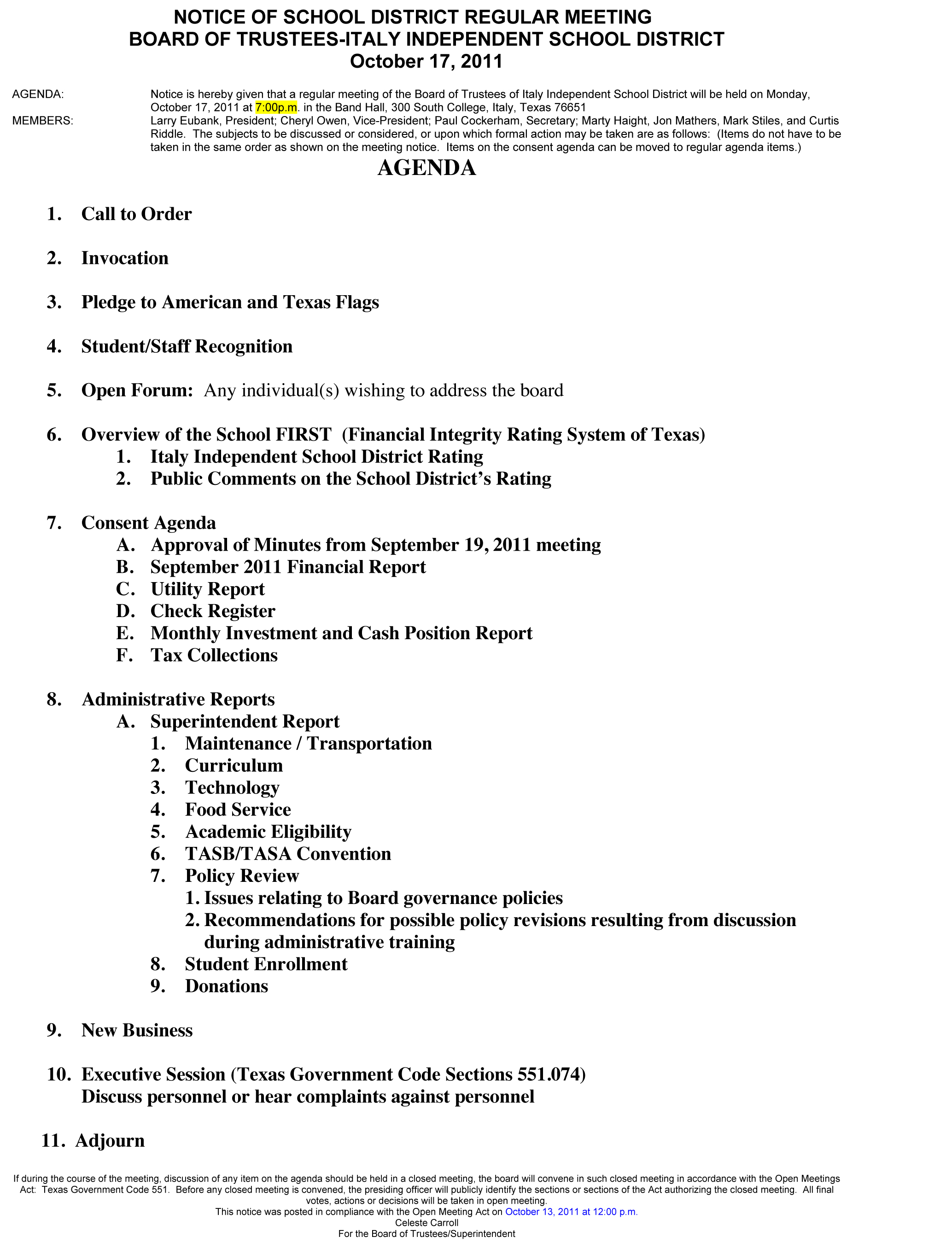 Agendas: Italy ISD School Board Training and Monthly Meeting, October 17, 2011 « previous story album next » Download original photo