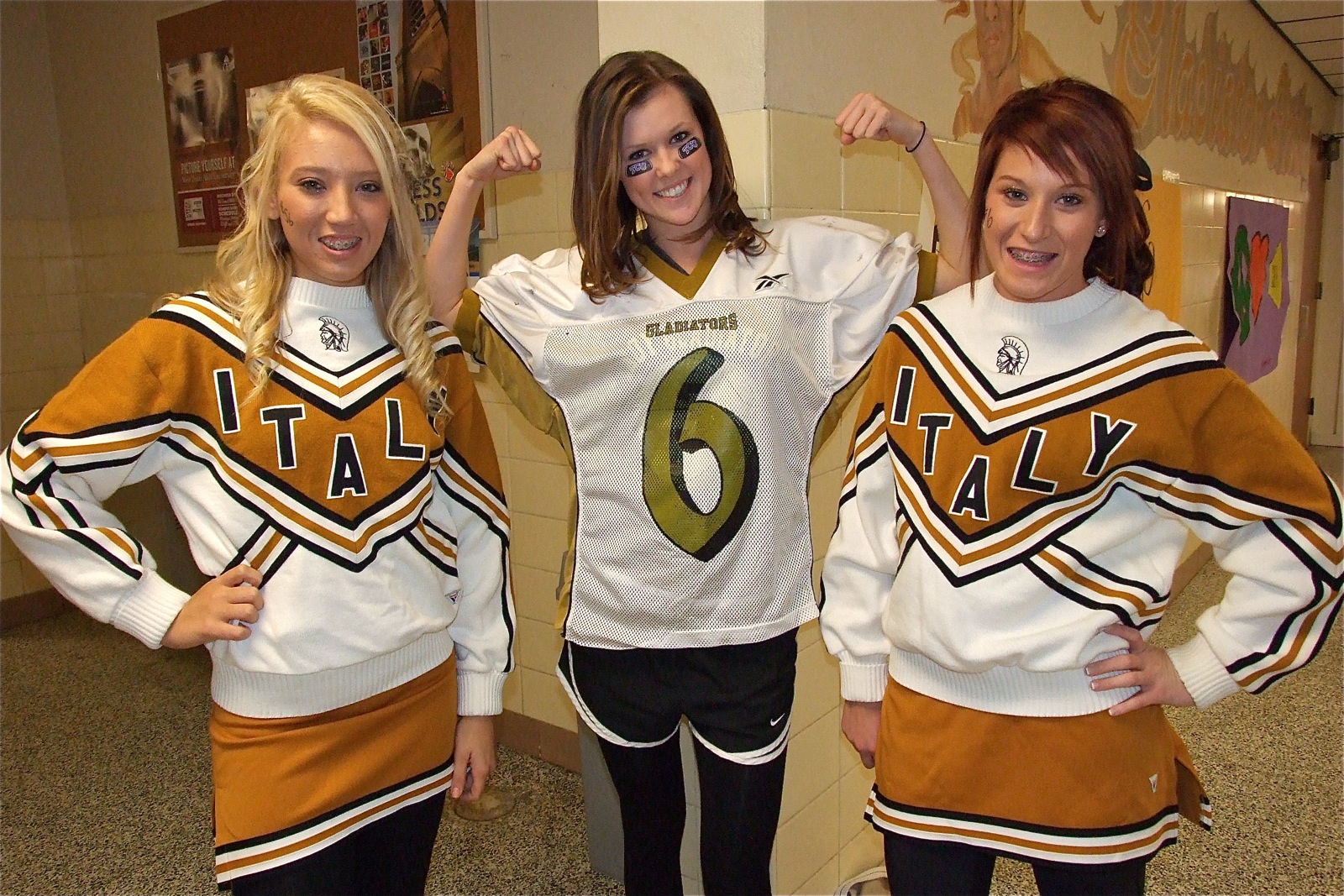 Playing the role of Gladiator quarterback Jase Holden, is Kaitlyn Rossa. Playing the role of two Italy cheerleaders vying for his affection are Megan Richards and Bailey Bumpus. (Barry Byers)