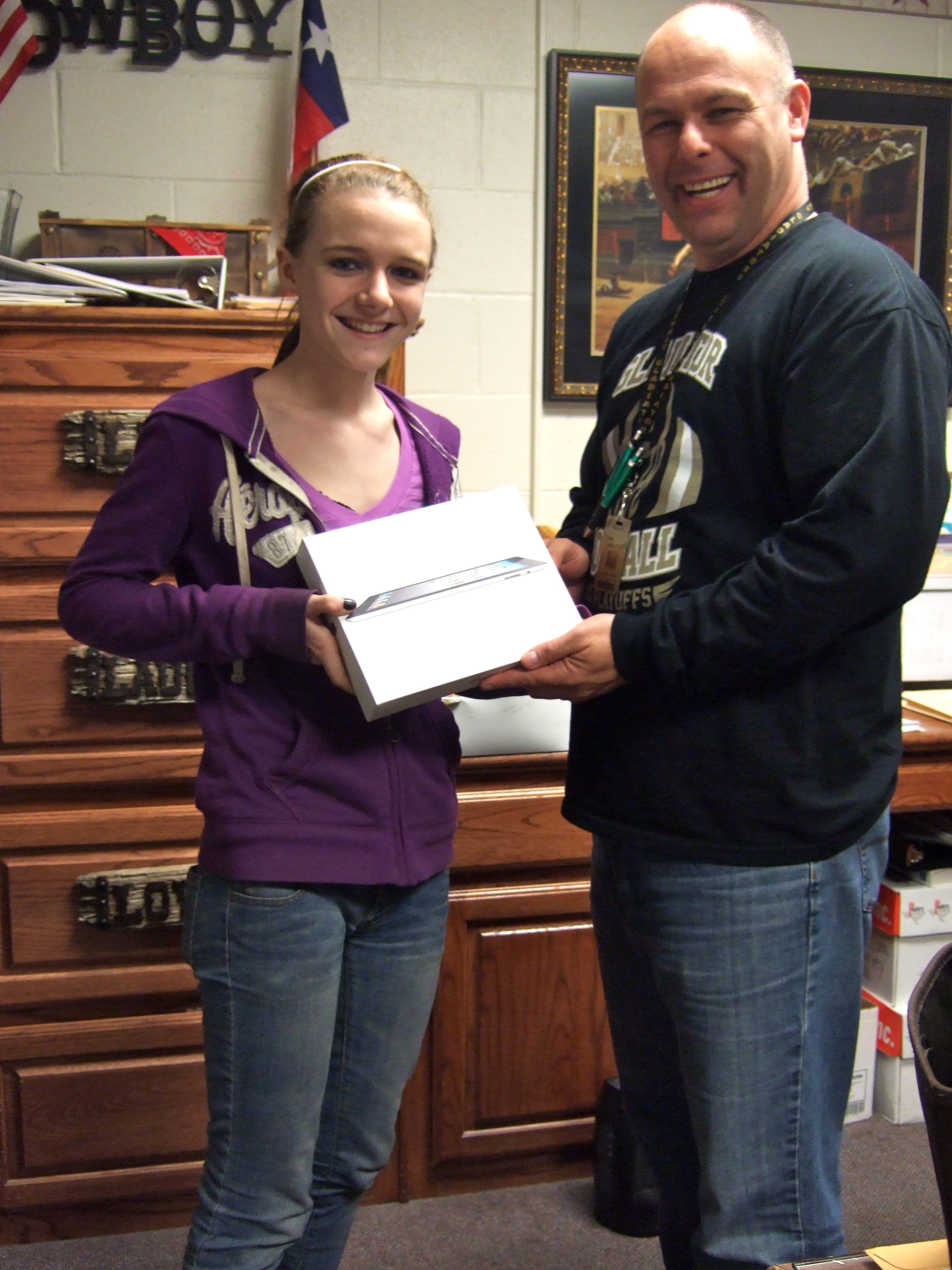 IHS/JH Perfect Attendance iPad Winners « previous story album next » Kayla Cummingham accepting the iPad from Mr. Joffre. (Cindy Sutherland) Download original photo