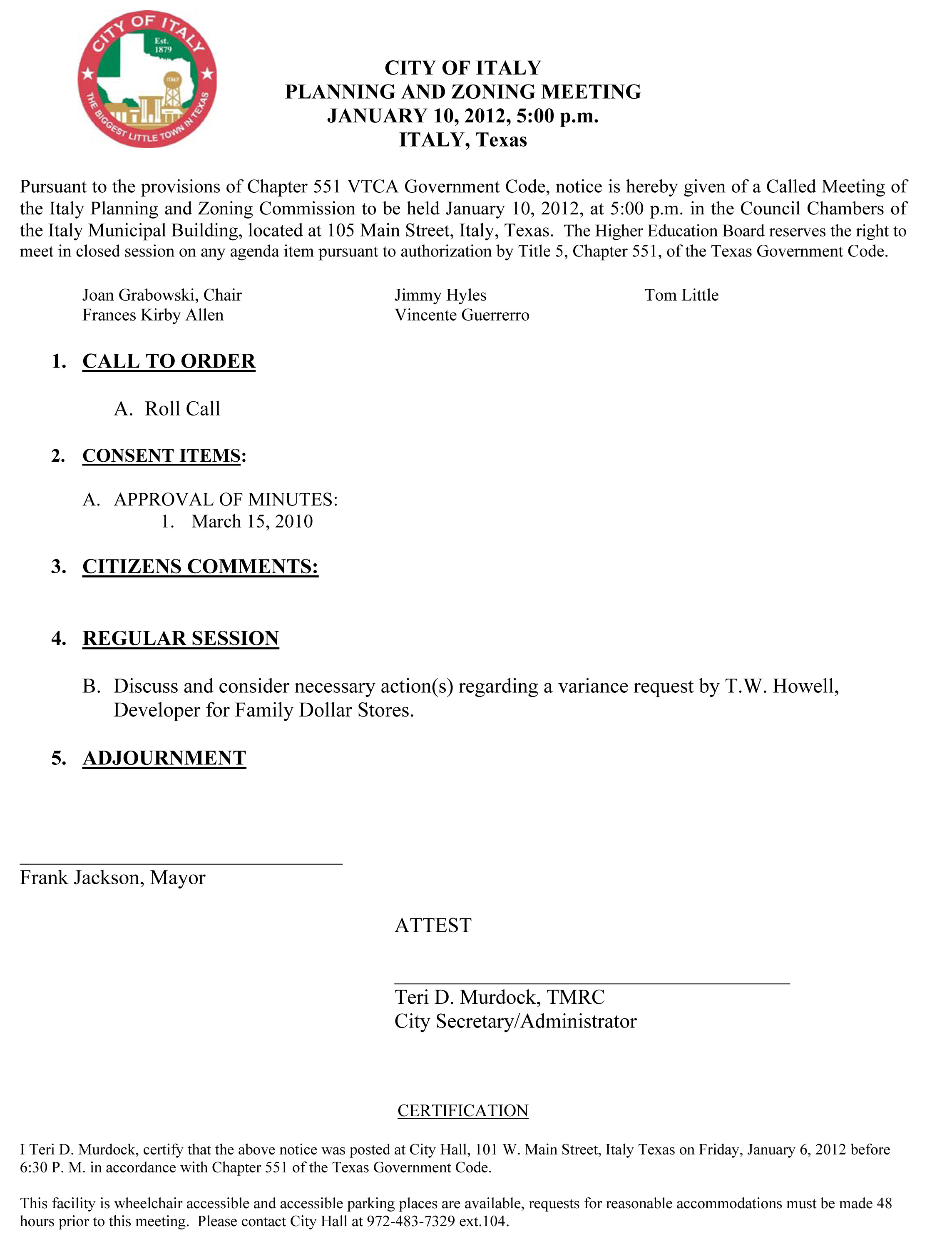 Agenda: Italy Planning and Zoning Called Meeting, Tuesday, January 10, 2012 « previous story album next » Download original photo