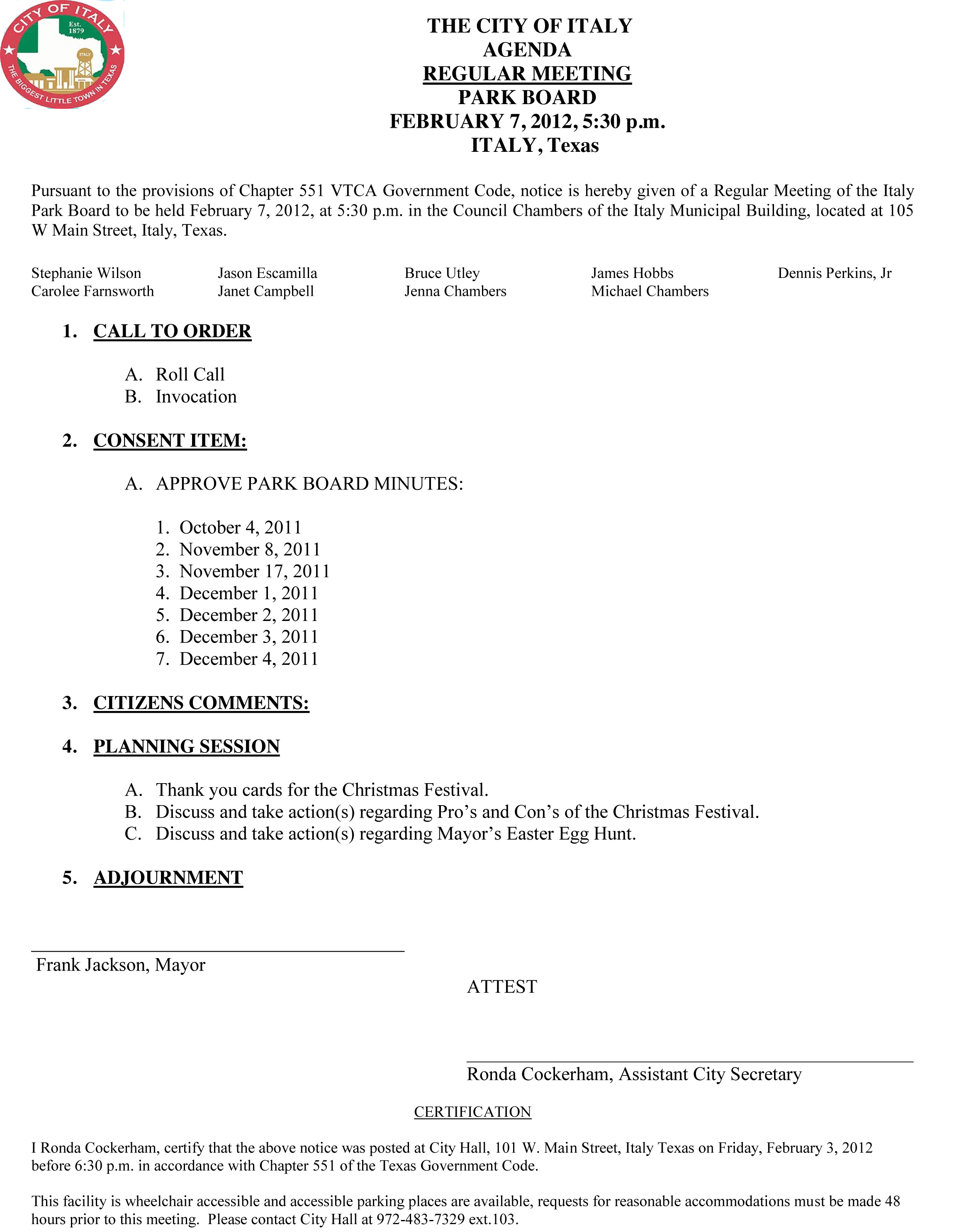 Agenda: Italy Park Board Meeting – Tuesday, February 7 2012 « previous story album next » Download original photo
