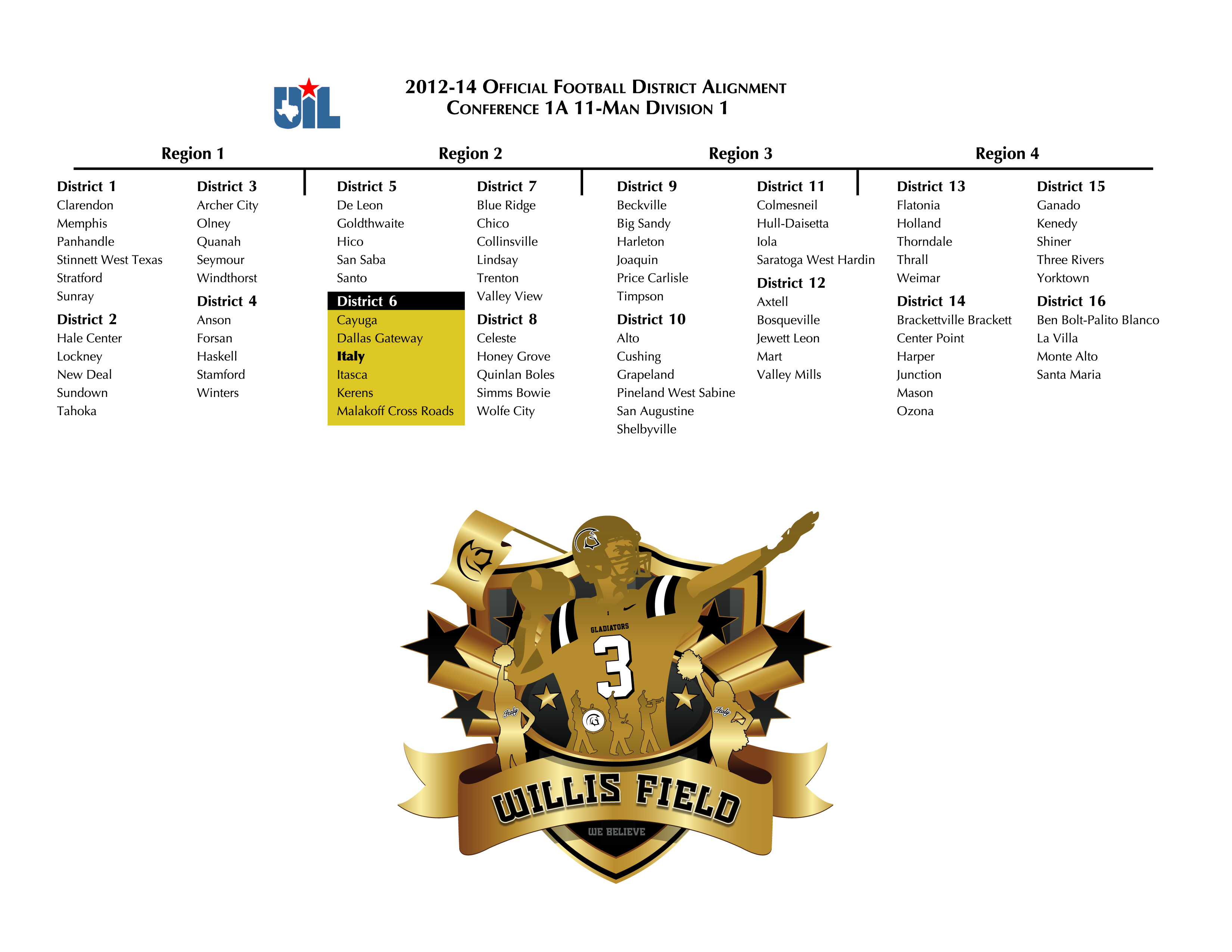 Redistricting announced, Italy ISD returns to a 1A classification « previous story album next » For Football, Italy will be in Conference 1A Region 2 District 6 Division 1, along with Cayuga, Dallas Gateway, Itasca, Kerens and Malakoff Cross Roads. (Barry Byers) Download original photo