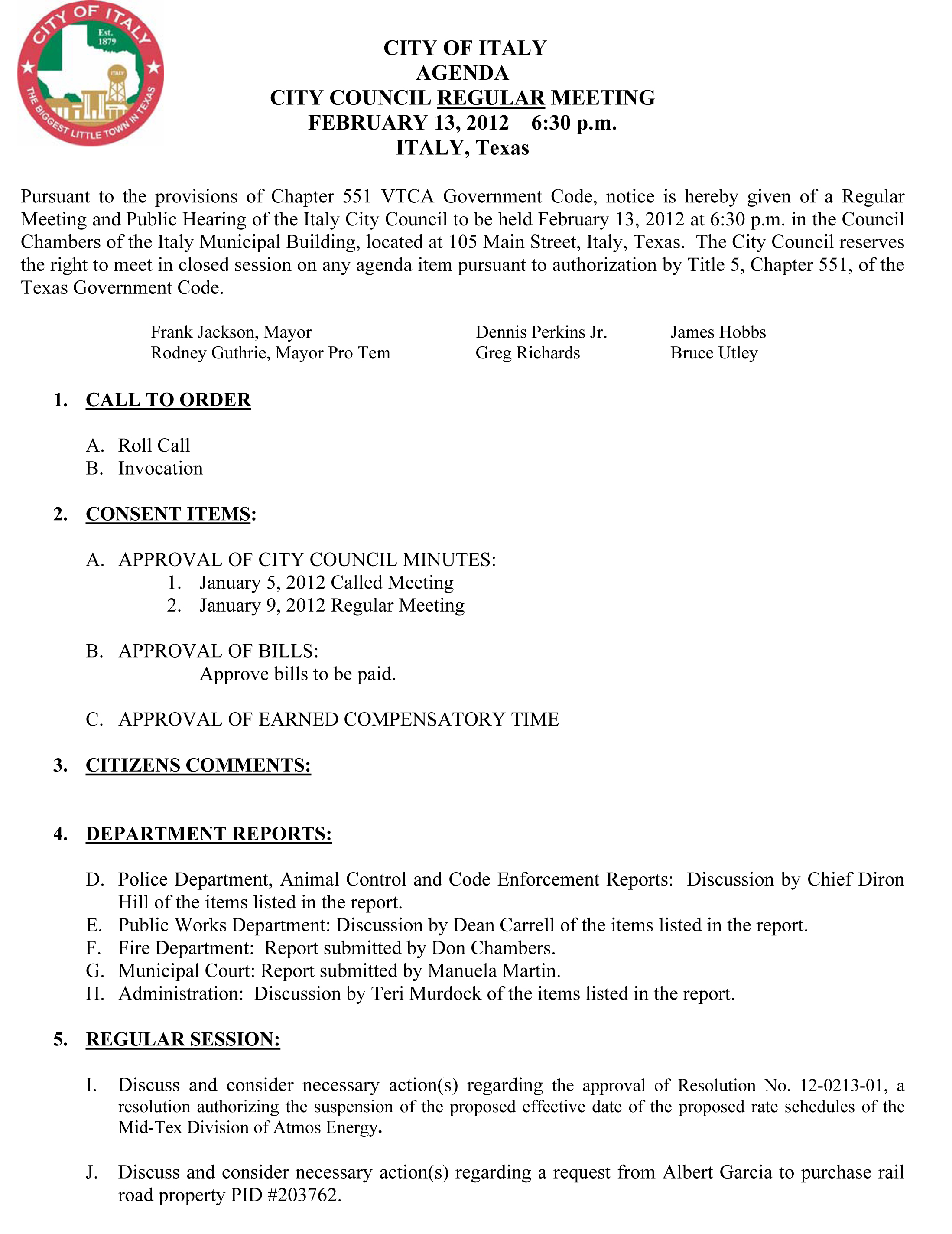 Agenda: Italy City Council Meeting – Monday, February 13, 2012 « previous story album next » Download original photo