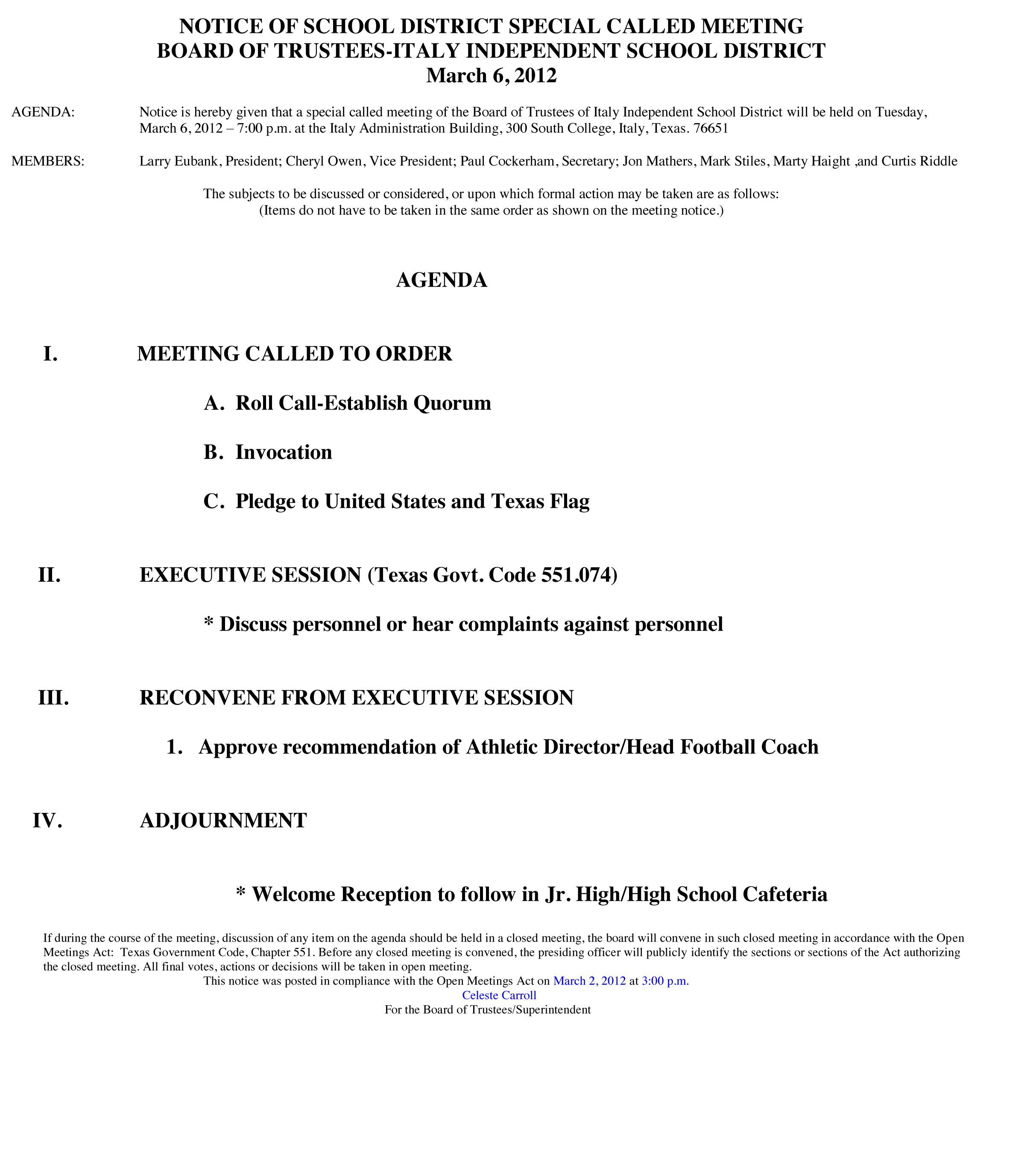 Agenda: Italy ISD School Board Called Meeting, Tuesday, March 6, 2012 « previous story album next » Download original photo
